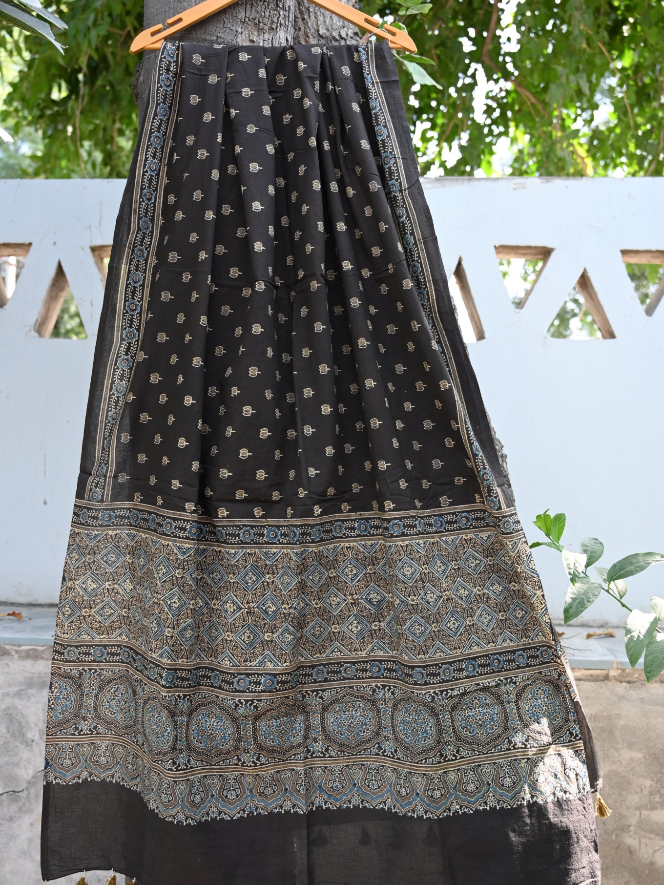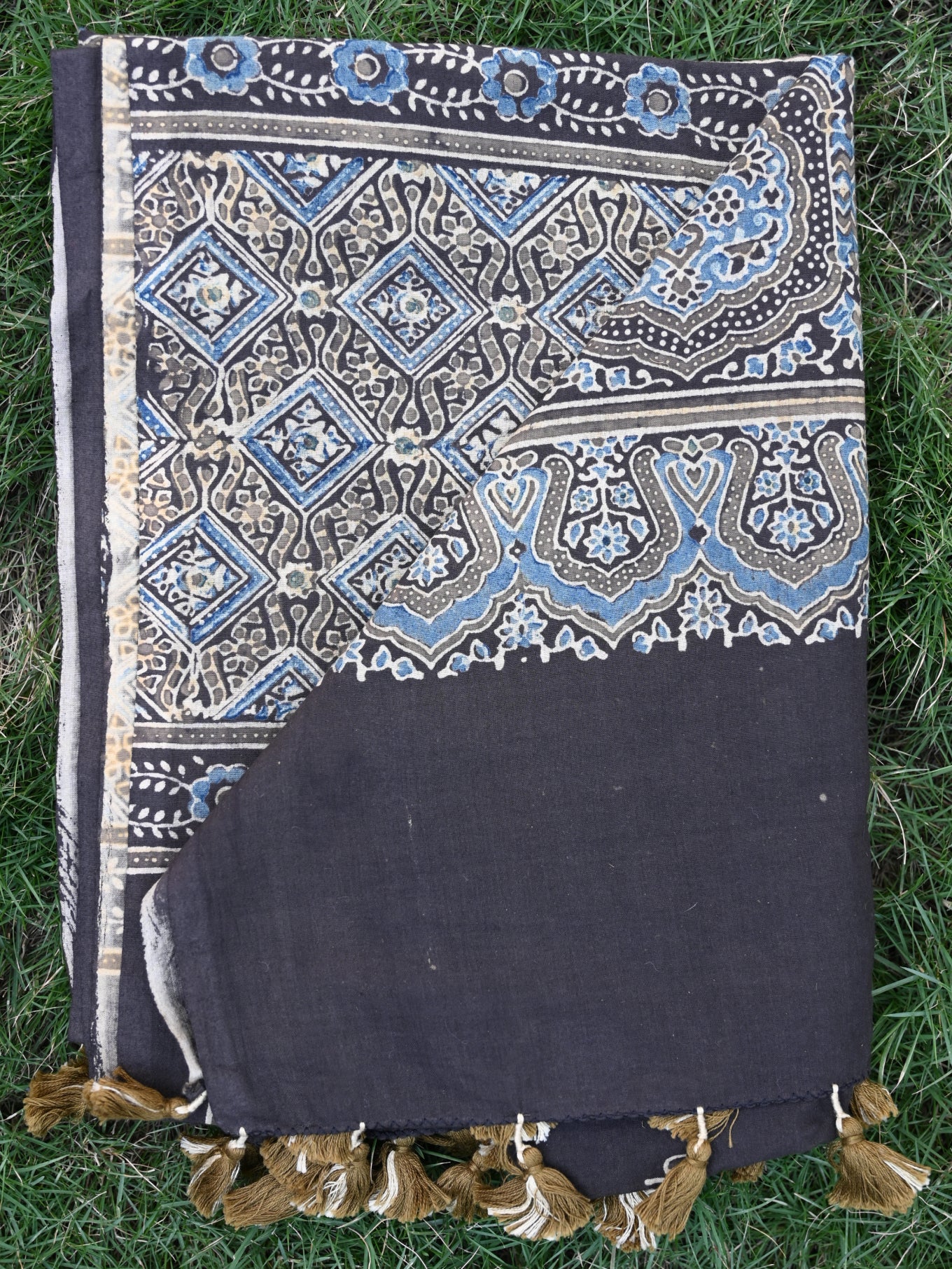 Elevate your style with our black Ajrakh cotton dupatta, featuring traditional hand-block prints. Its soft fabric and timeless design make it a versatile accessory for any occasion!
