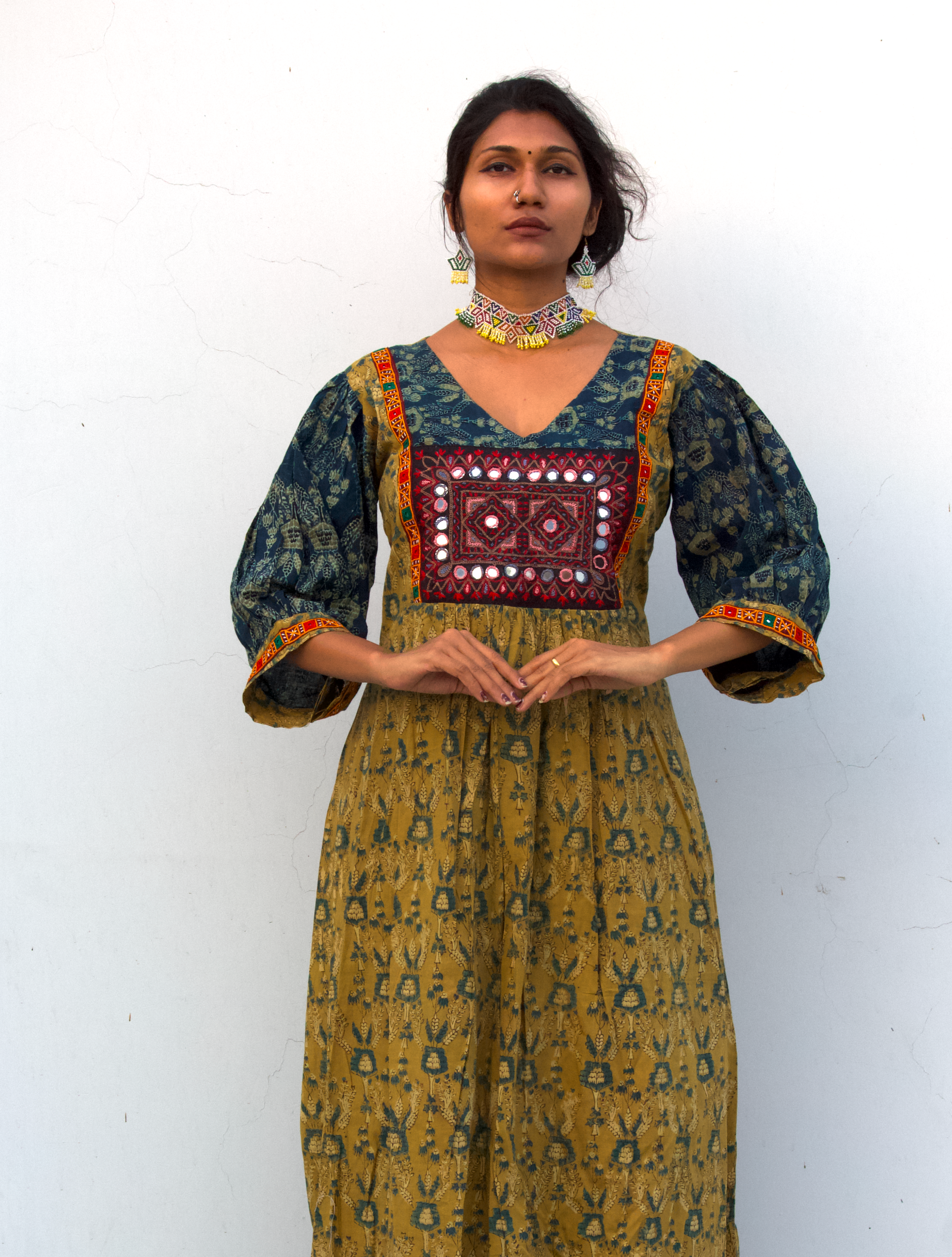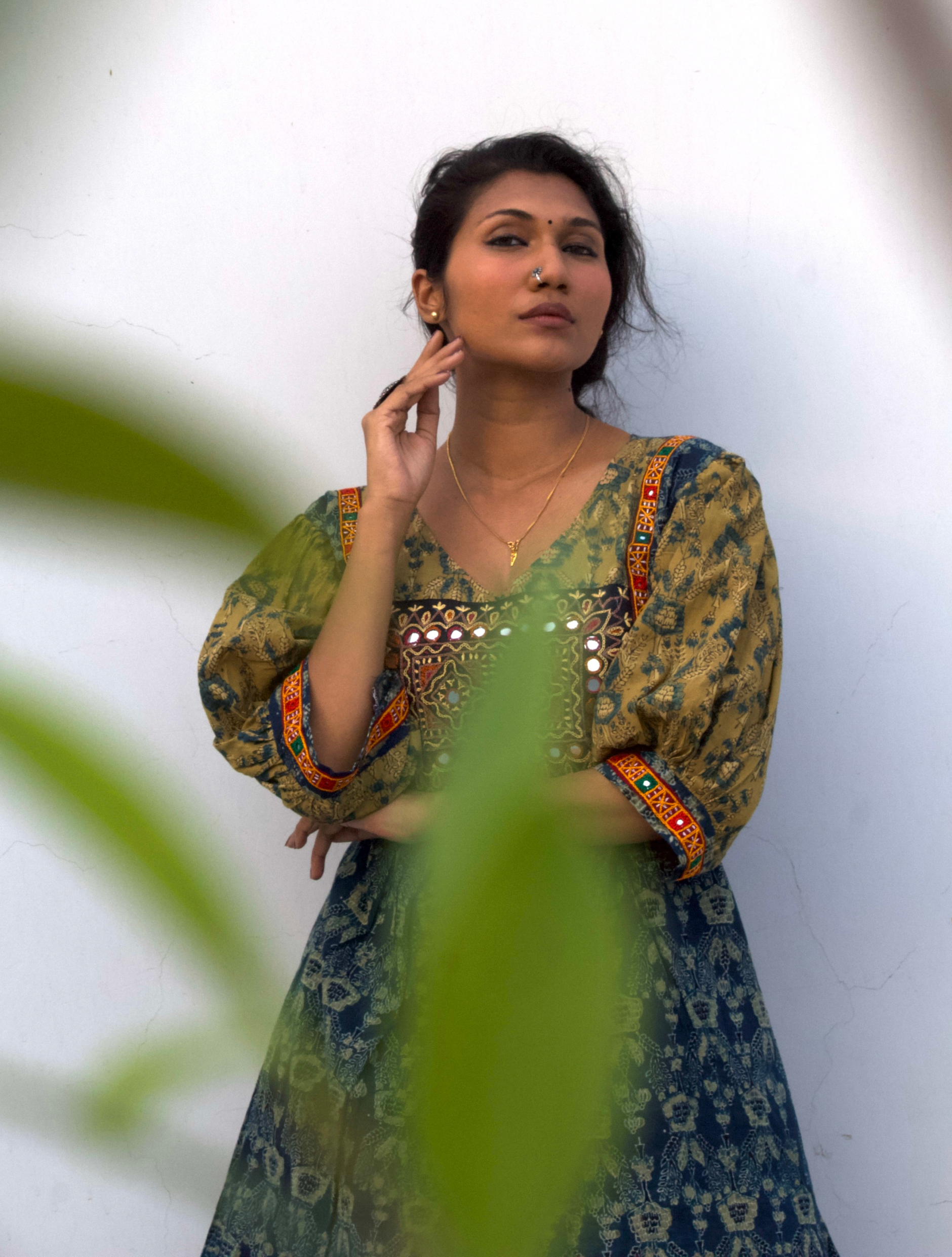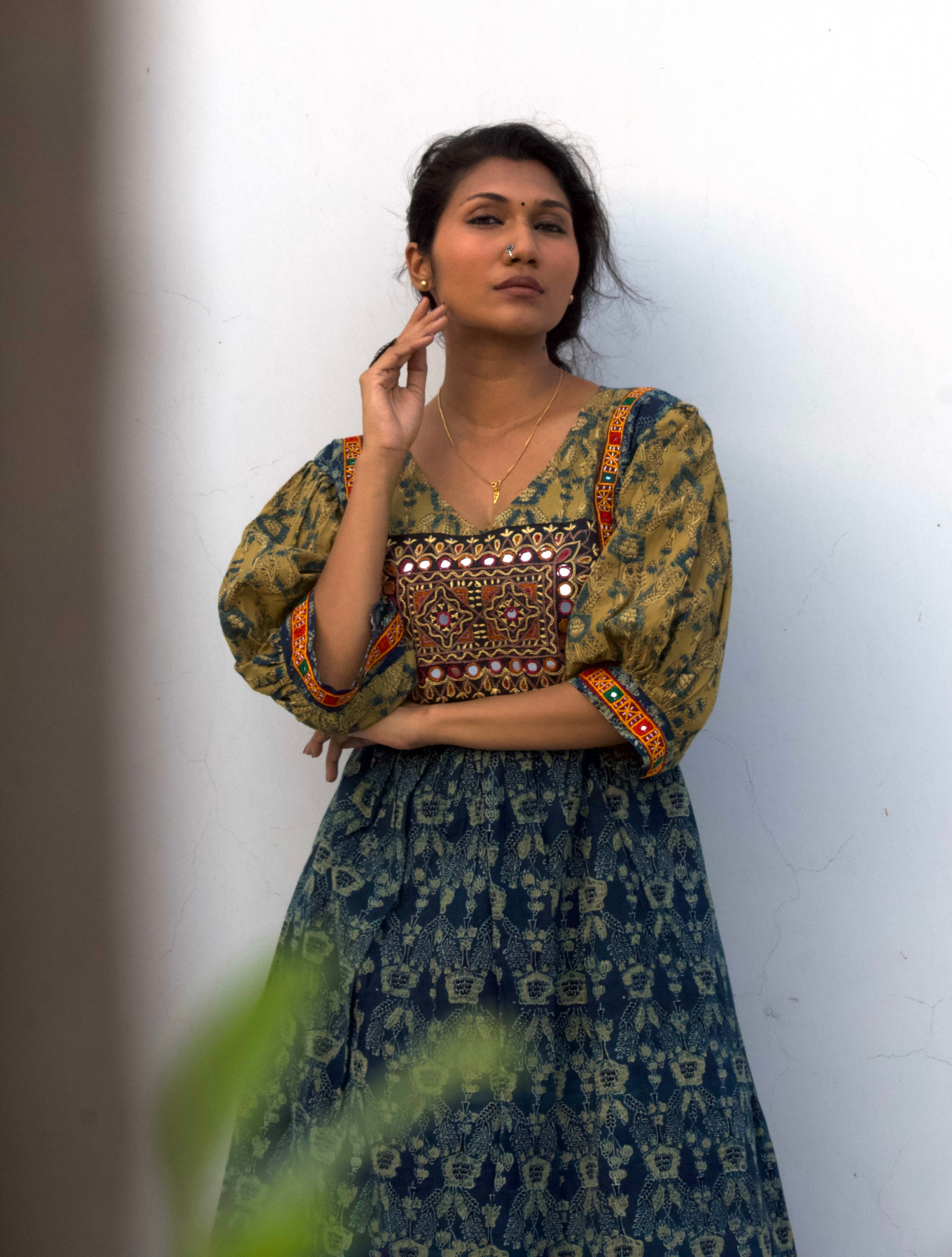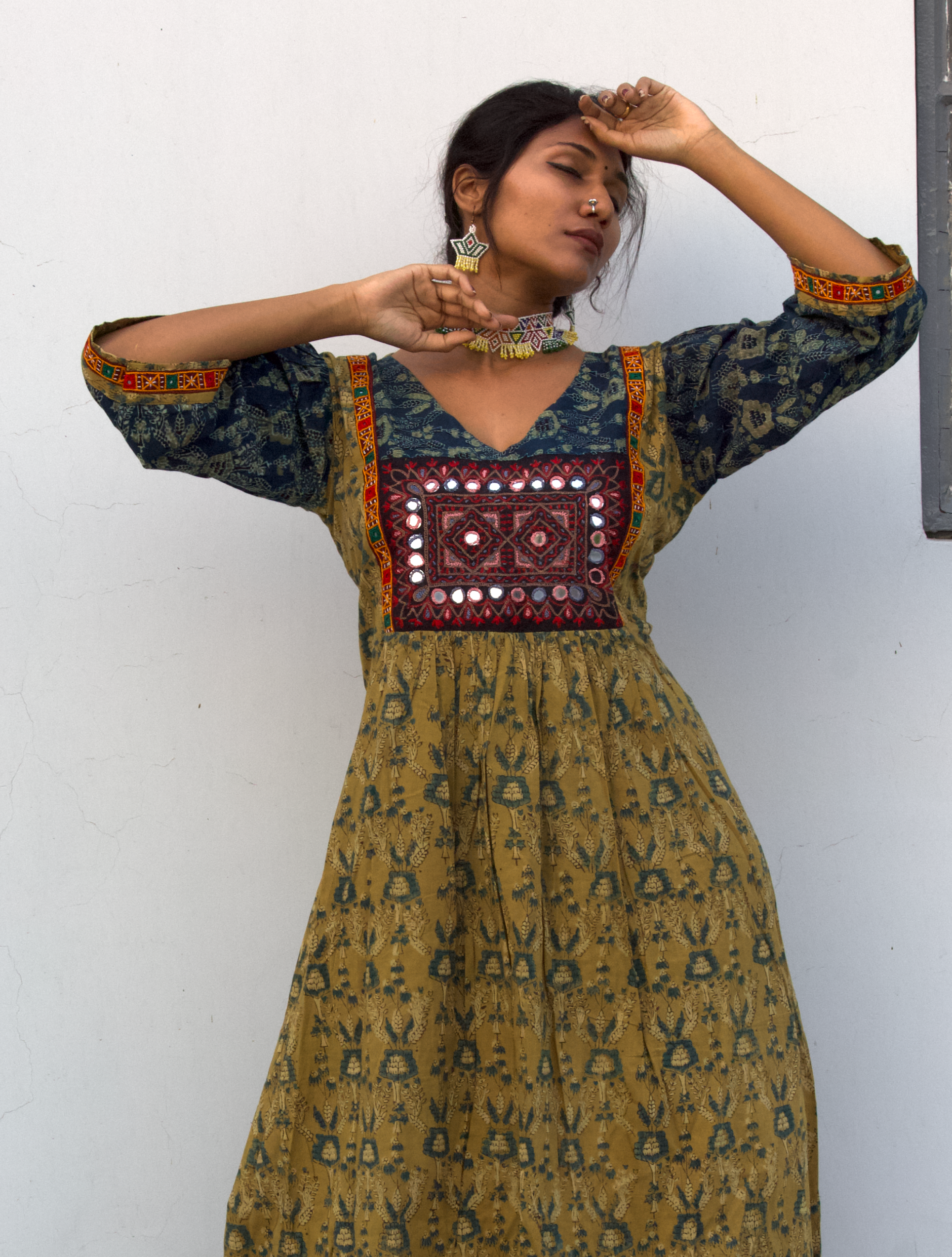 Celebrate timeless craft with this Ajrakh Kurta Dress, featuring handblock prints and mirror work accents.