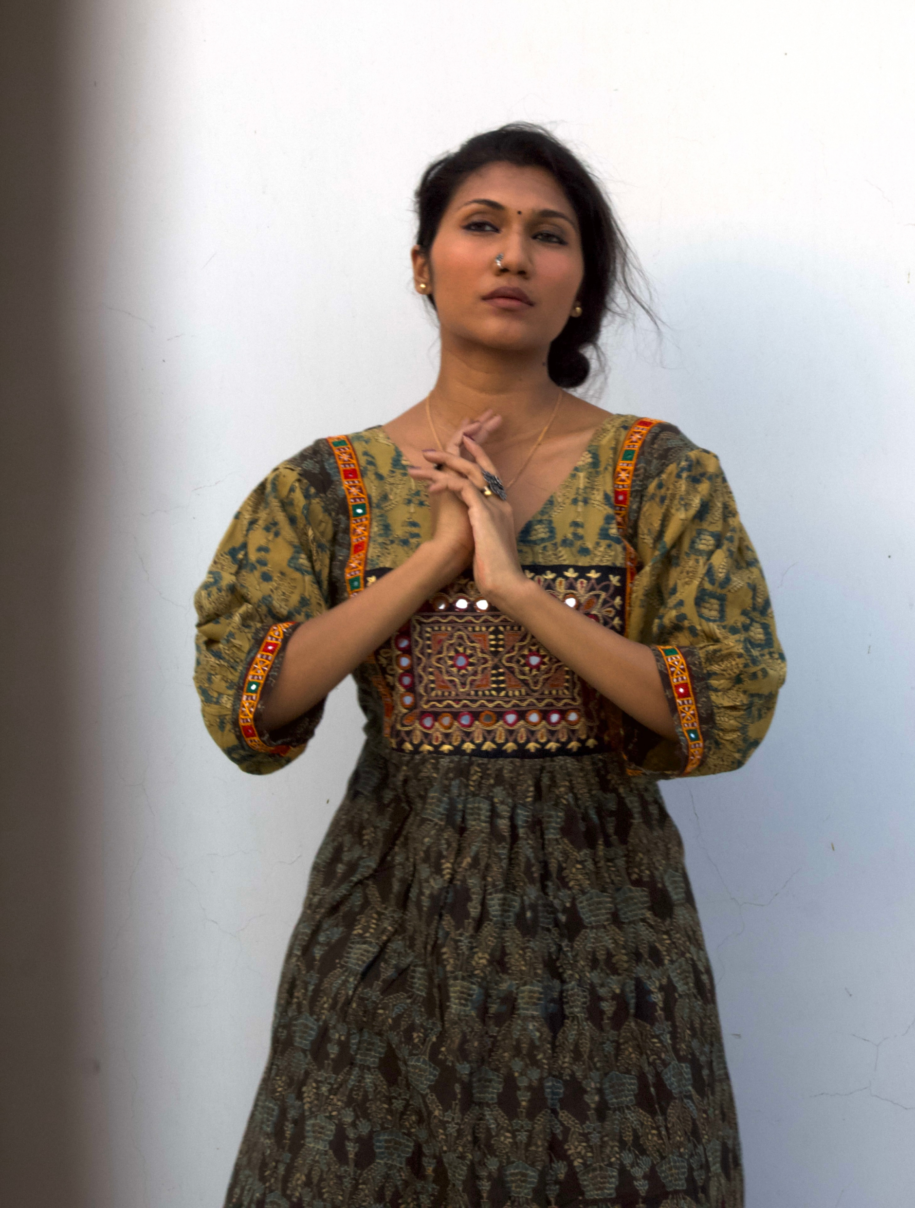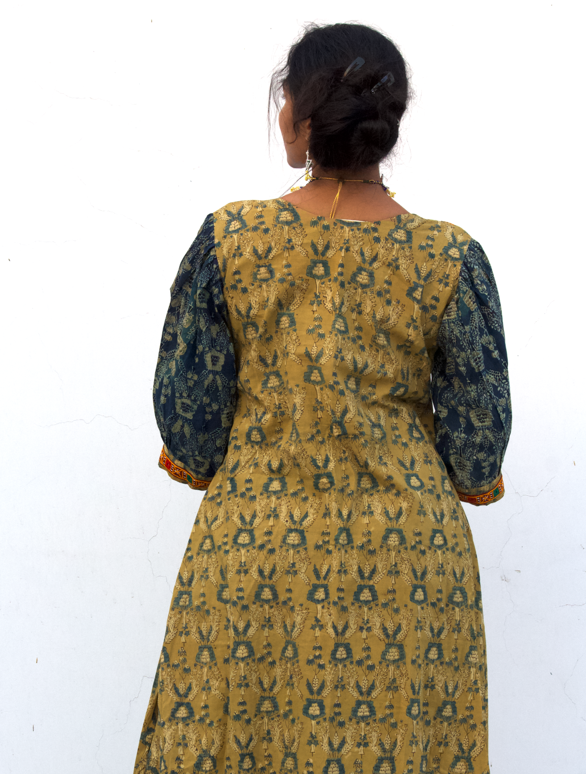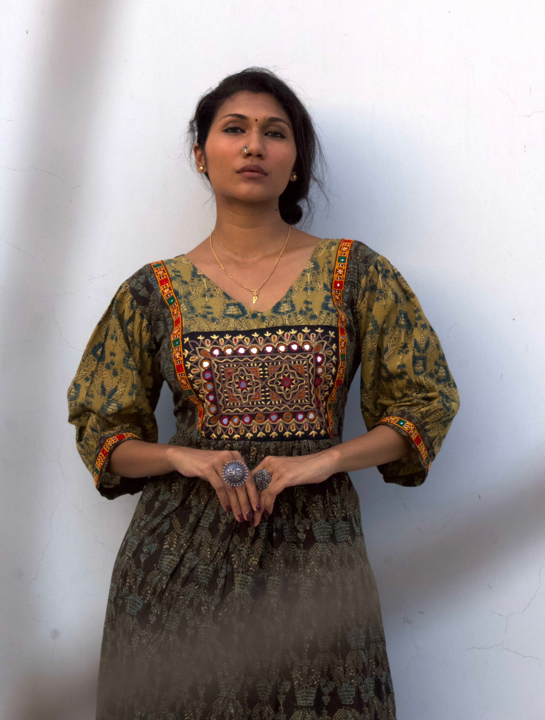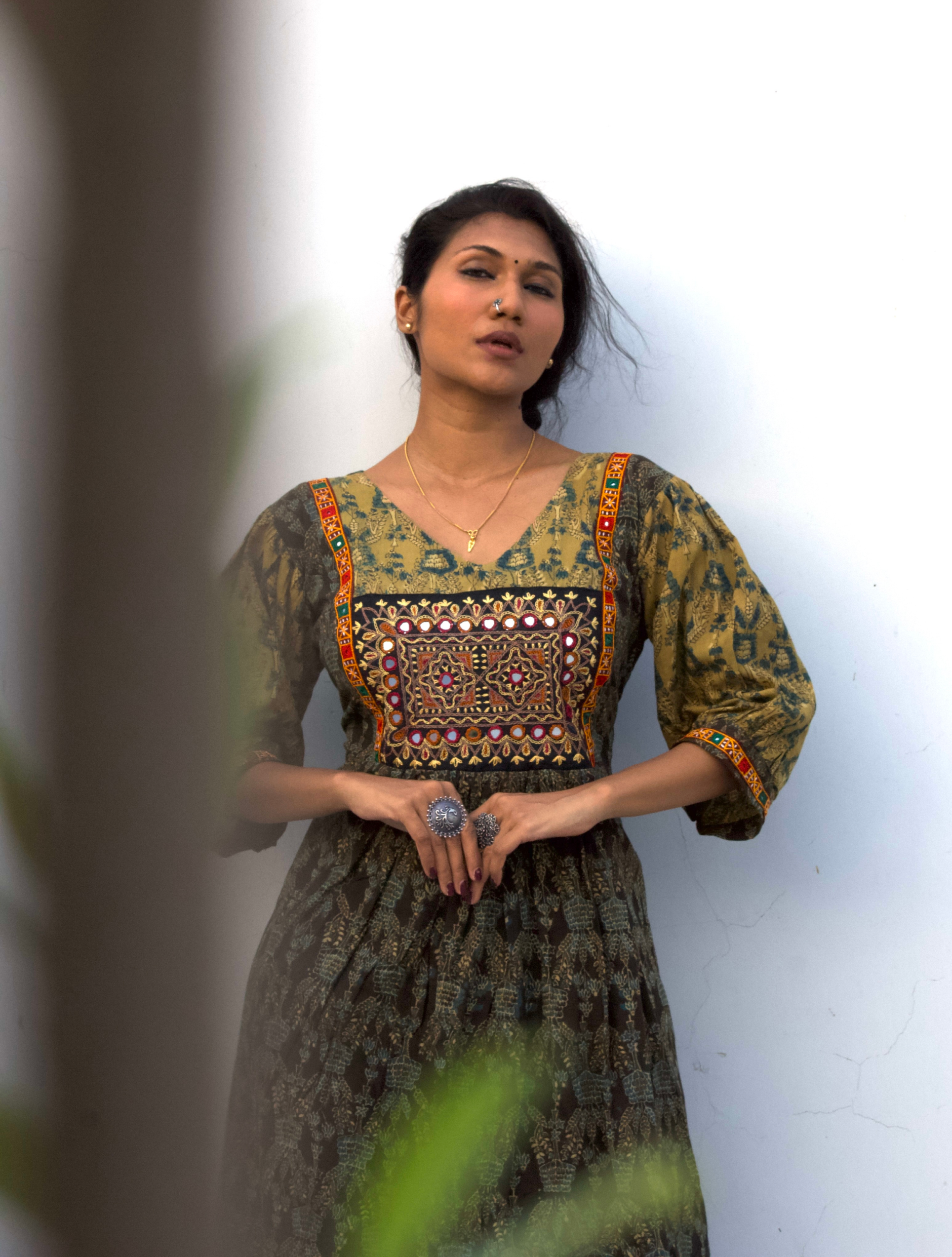 Celebrate timeless craft with this Ajrakh Kurta Dress, featuring handblock prints and mirror work accents.