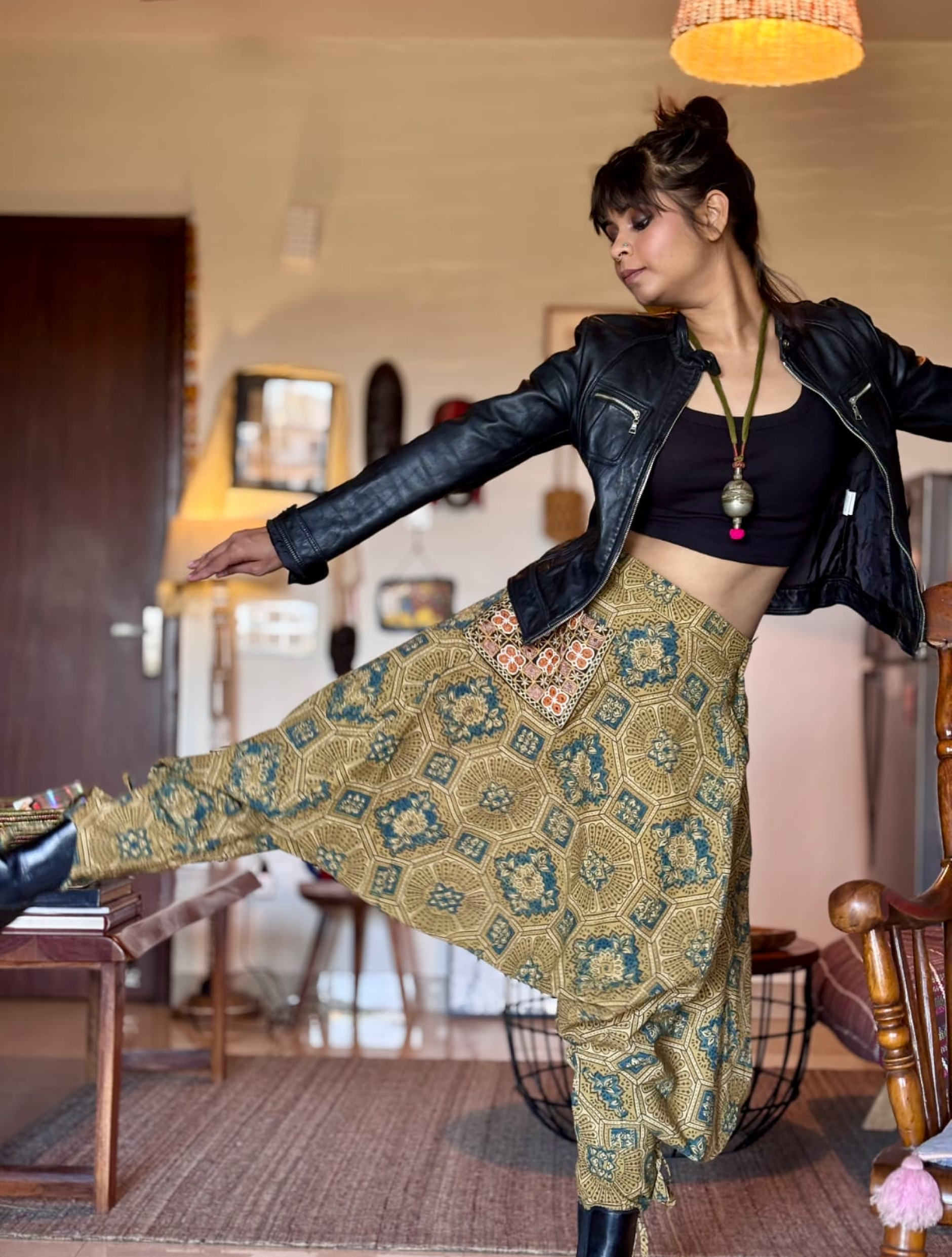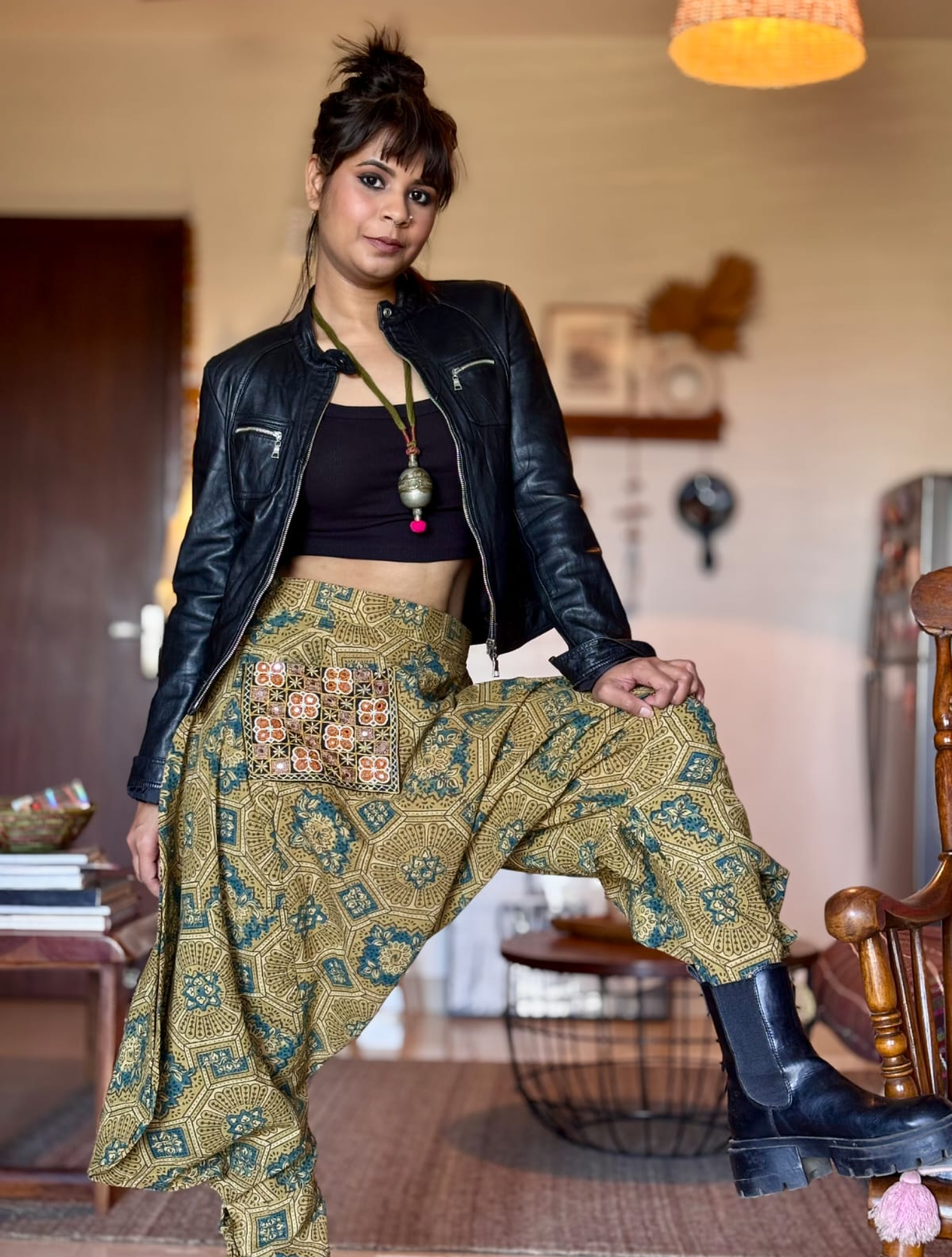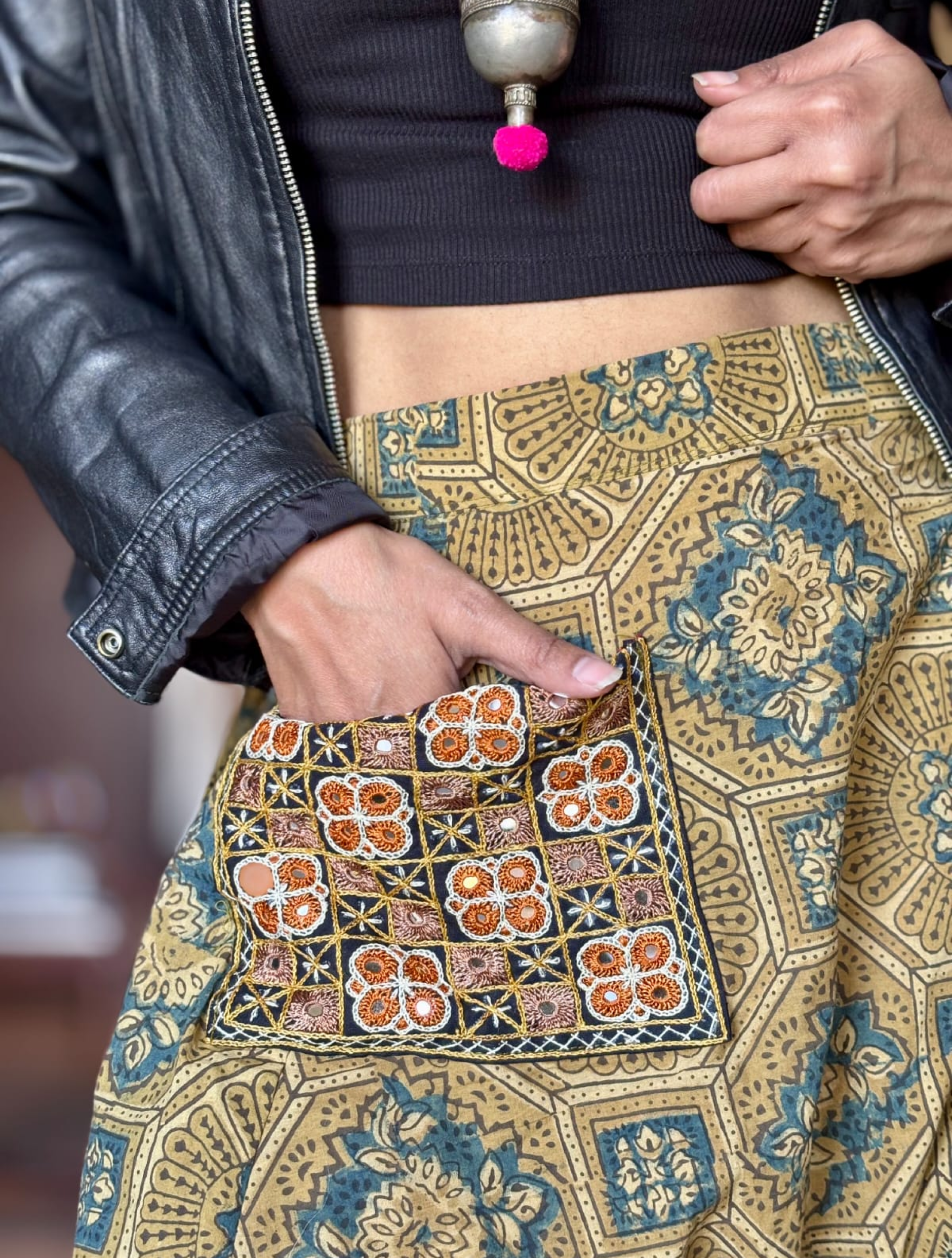 These Ajrakh pants feature traditional hand block-printing with a unique embroidered pocket detail. The comfortable fit and artisanal design make them perfect for adding a touch of elegance to casual or ethnic wear.