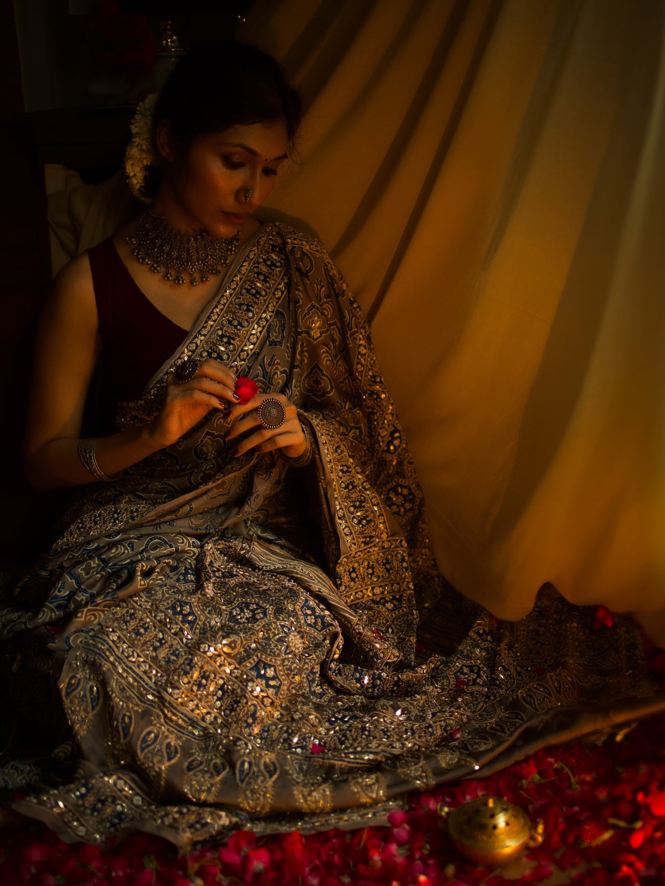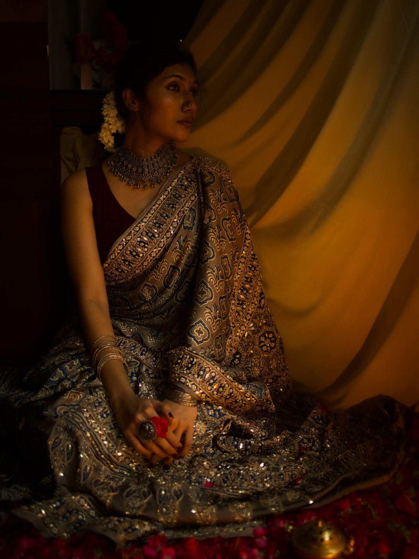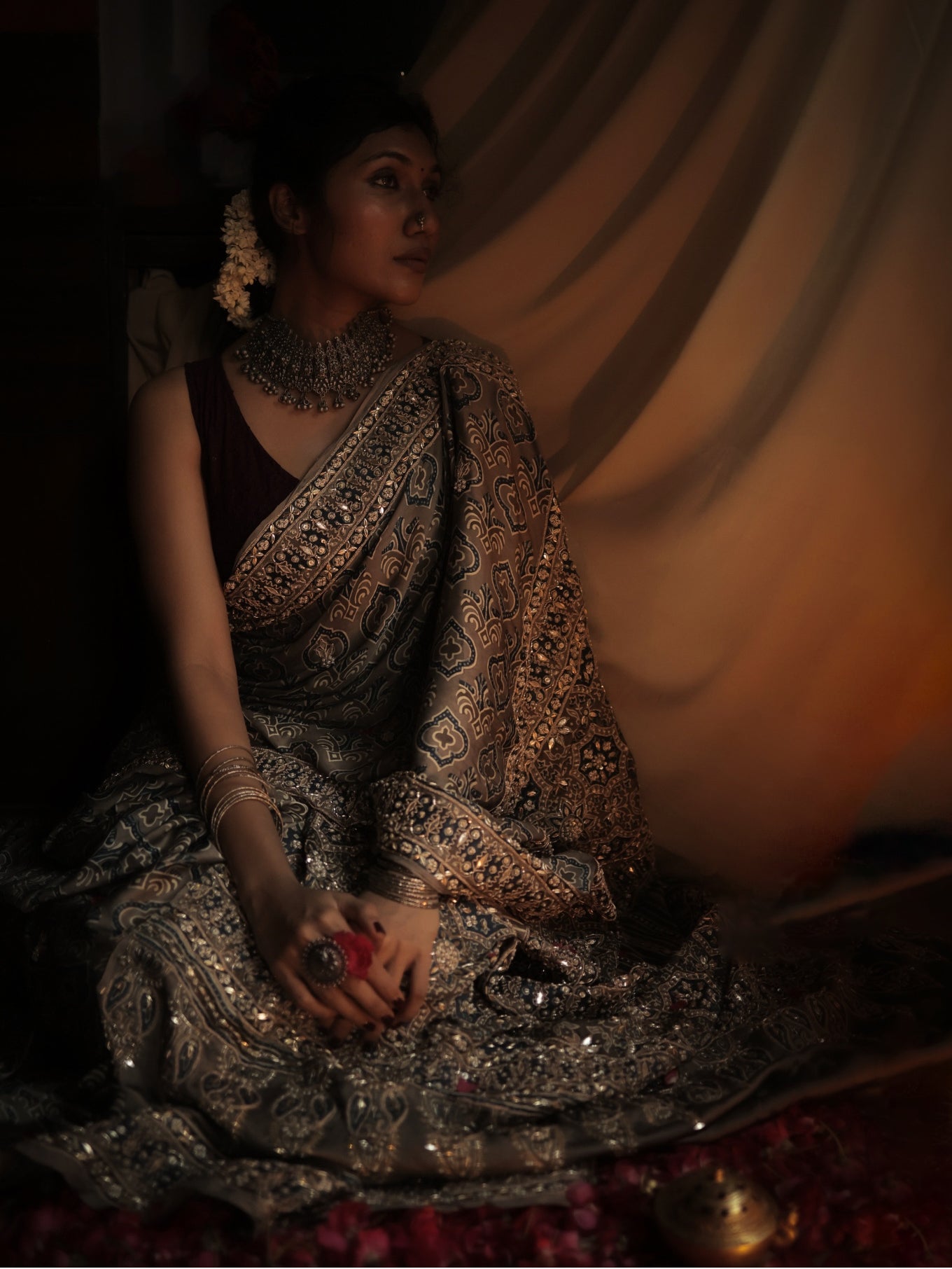 Introducing our exquisite Ajrakh Silk Saree, adorned with intricate Zardozi and delicate pearl handwork—an elegant masterpiece crafted for the wedding season. This saree combines the timeless charm of Ajrakh printing with the opulence of traditional Zardozi embroidery, enhanced by meticulously placed pearls that add a touch of luxury and sophistication. Each piece is thoughtfully designed to radiate grace, making it the perfect choice for brides and wedding guests alike. Embrace the allure of heritage craftsmanship with a saree that celebrates artistry and elegance.