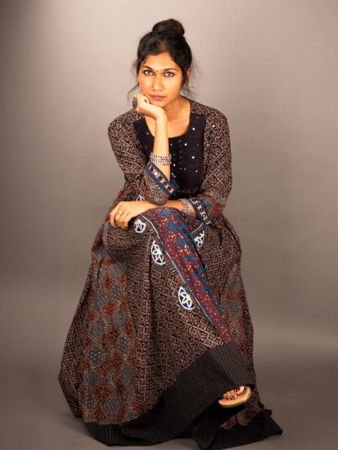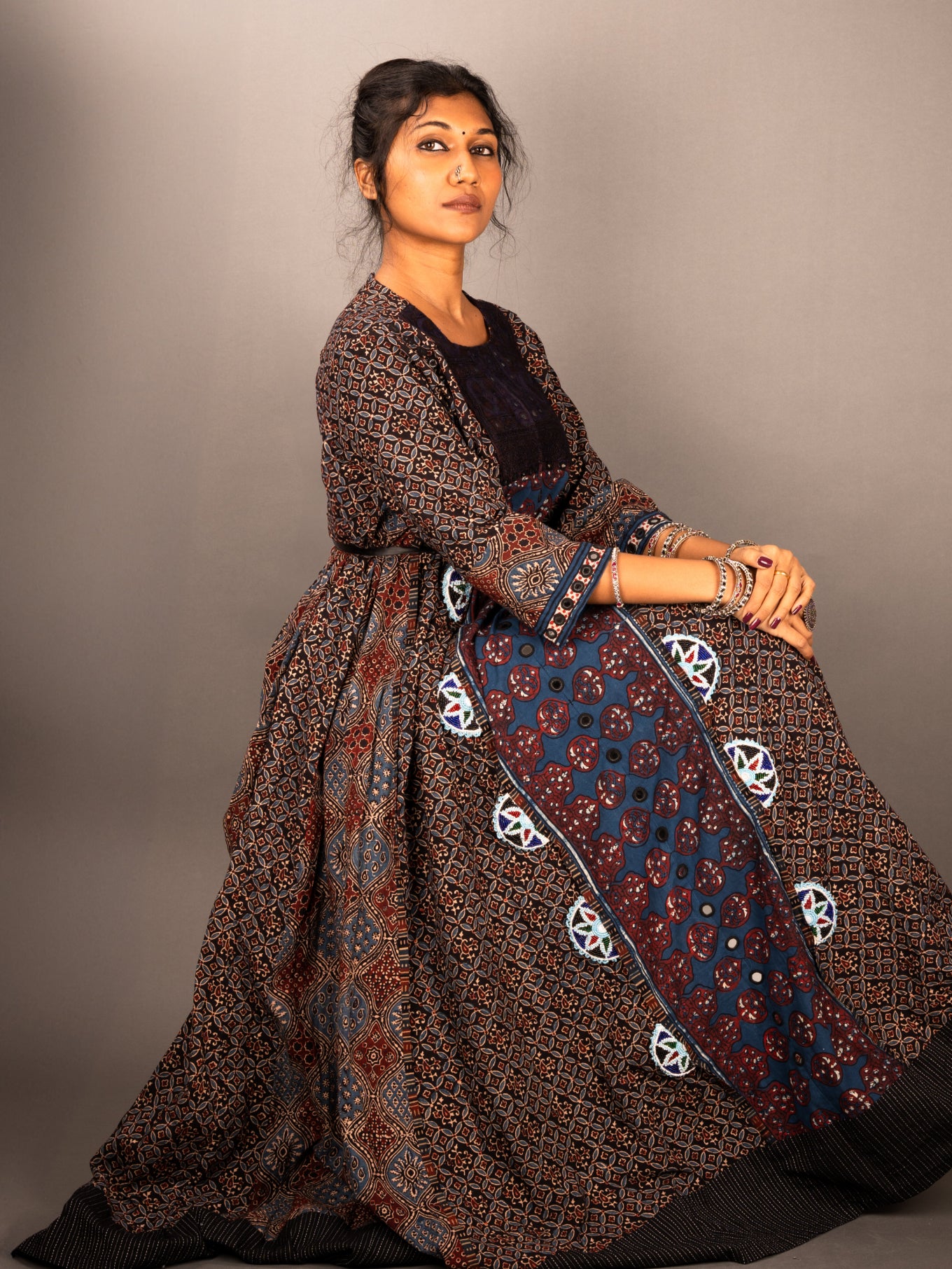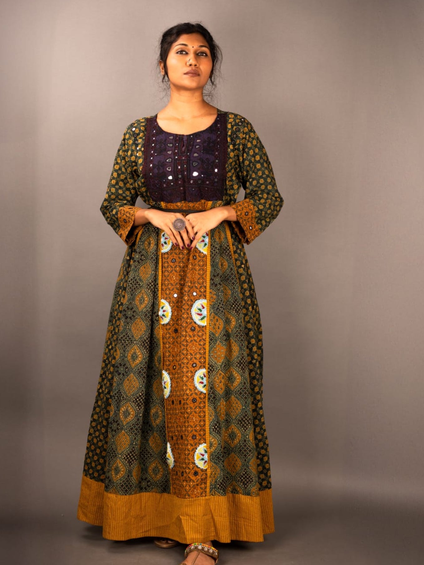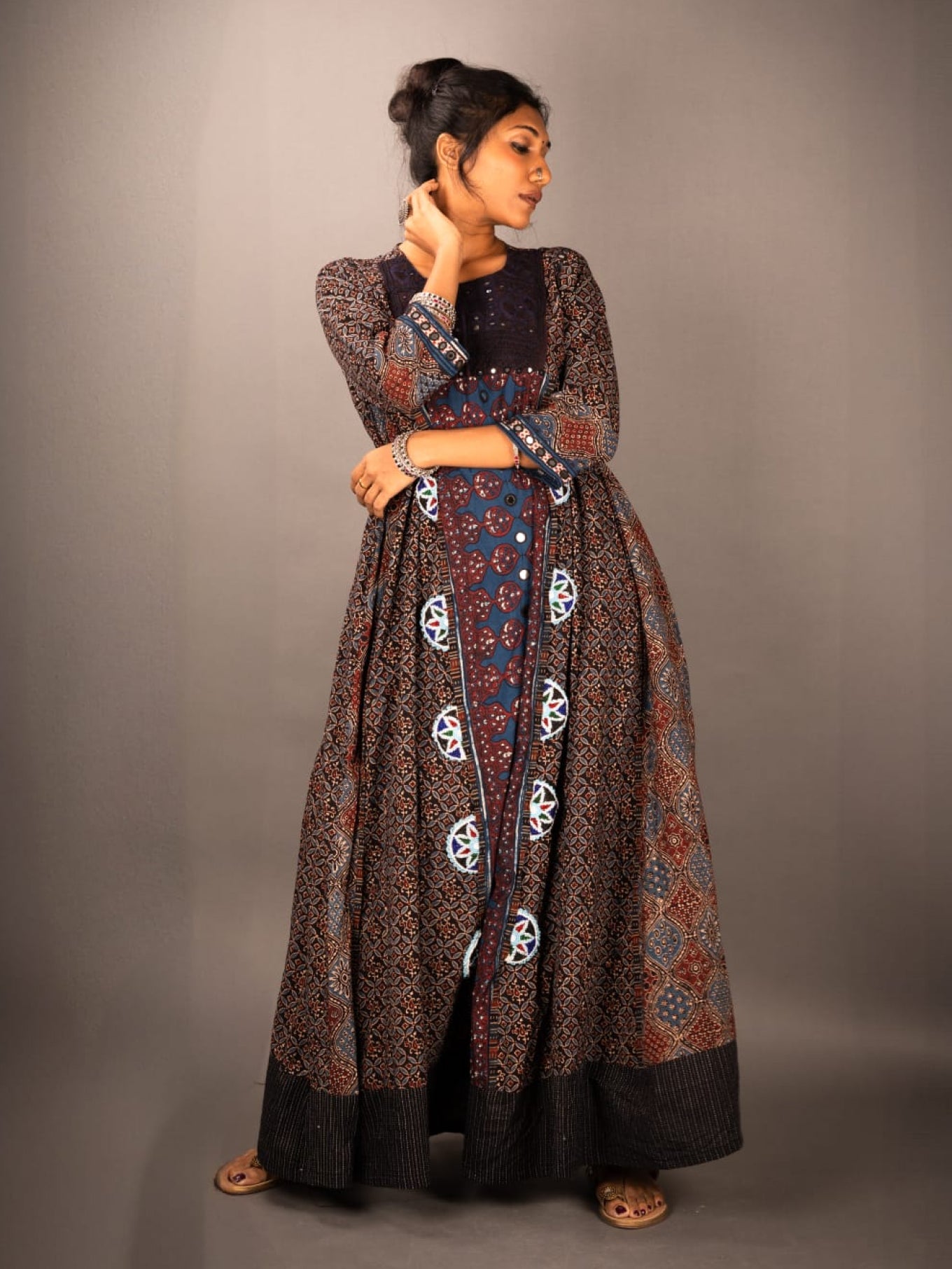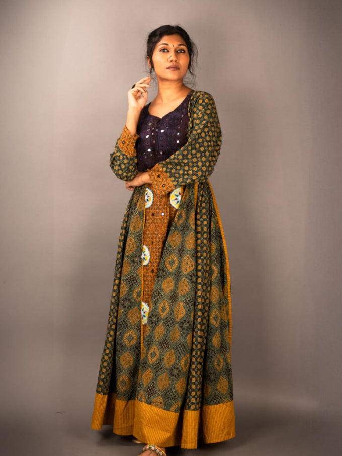 This Anarkali long maxi dress features intricate patterns and a flowing silhouette, blending traditional elegance with modern style. Perfect for festive or special occasions, the soft fabric and detailed design offer comfort while making a bold statement.