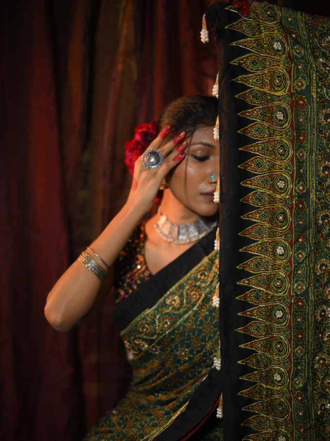 This green modal silk saree is beautifully adorned with intricate pal and dapka work, showcasing traditional craftsmanship. The vibrant green hue adds a fresh, lively touch, while the detailed embroidery elevates its elegance. Perfect for weddings or special occasions, this saree combines cultural charm with luxurious appeal.