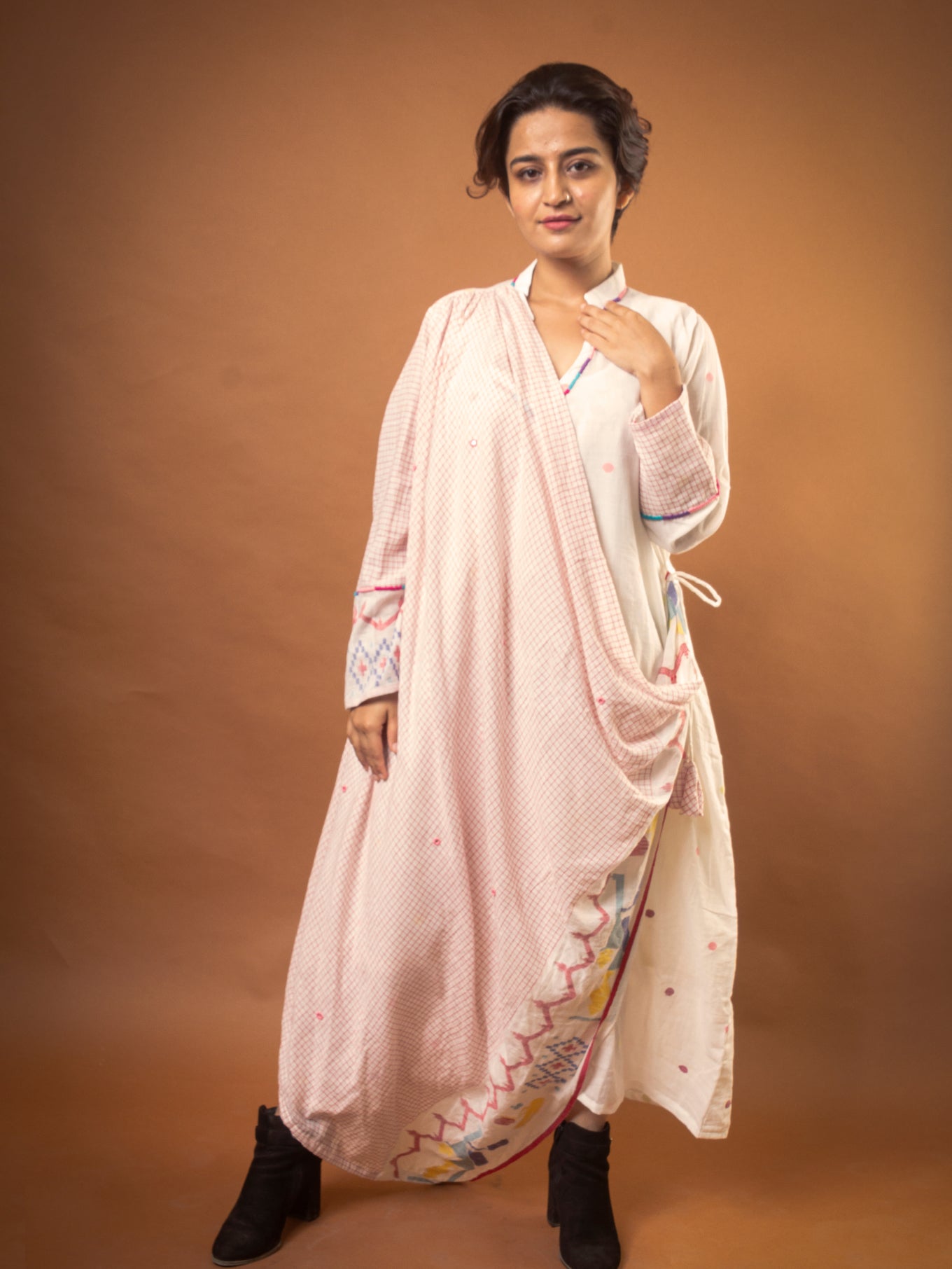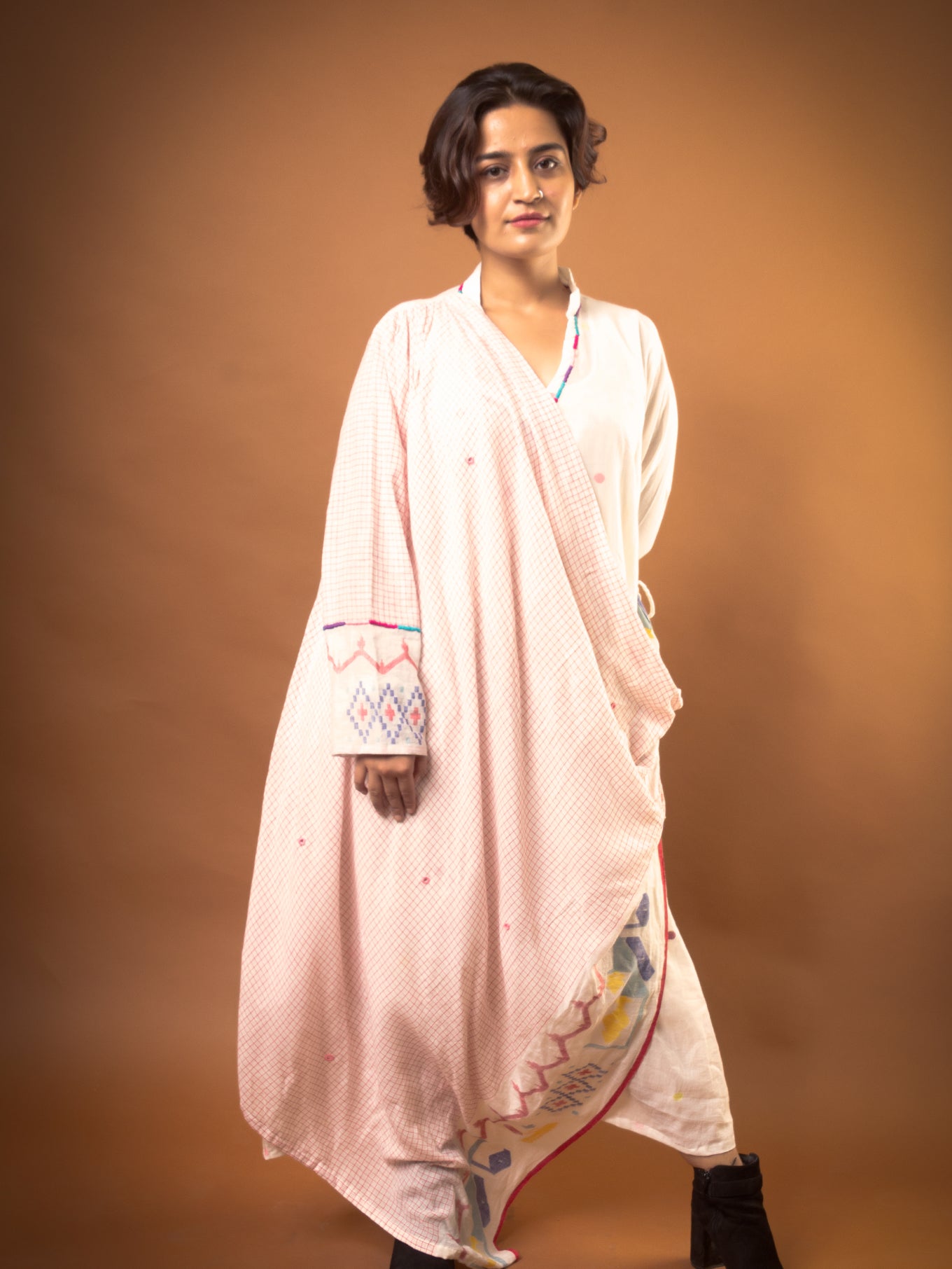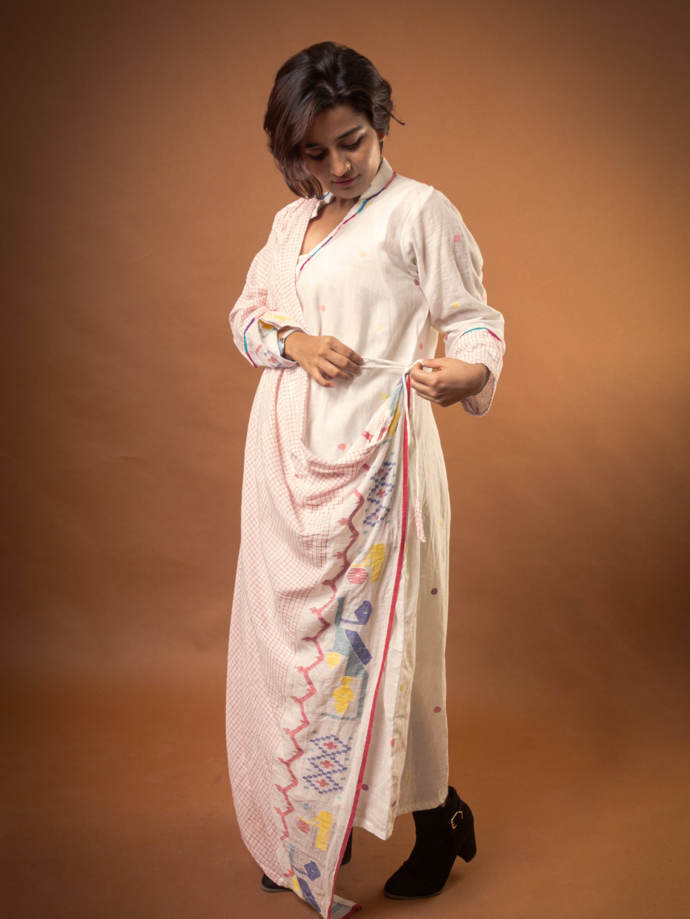 The Jamdani Overlap Dress combines traditional craftsmanship with modern style. Featuring intricate handwoven patterns and a unique overlap design, this dress offers both elegance and comfort, perfect for any occasion.