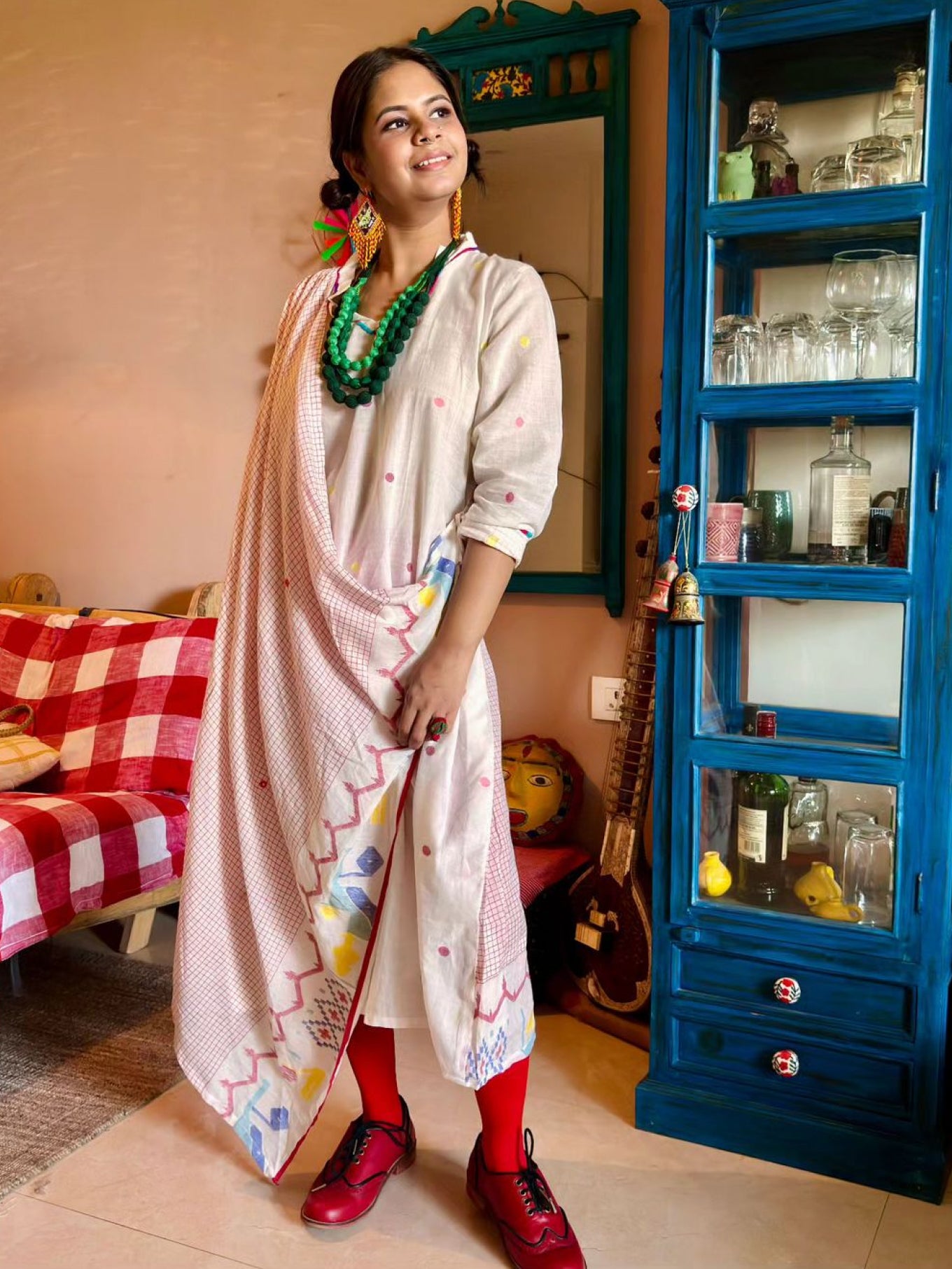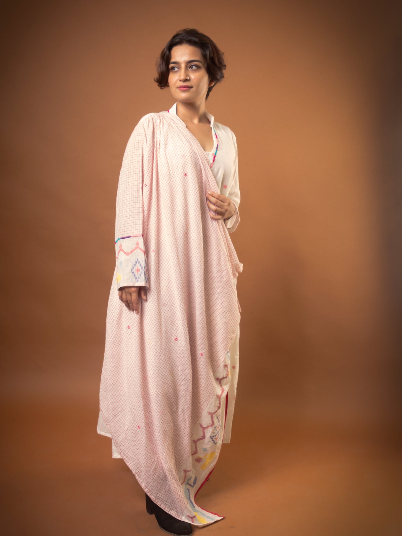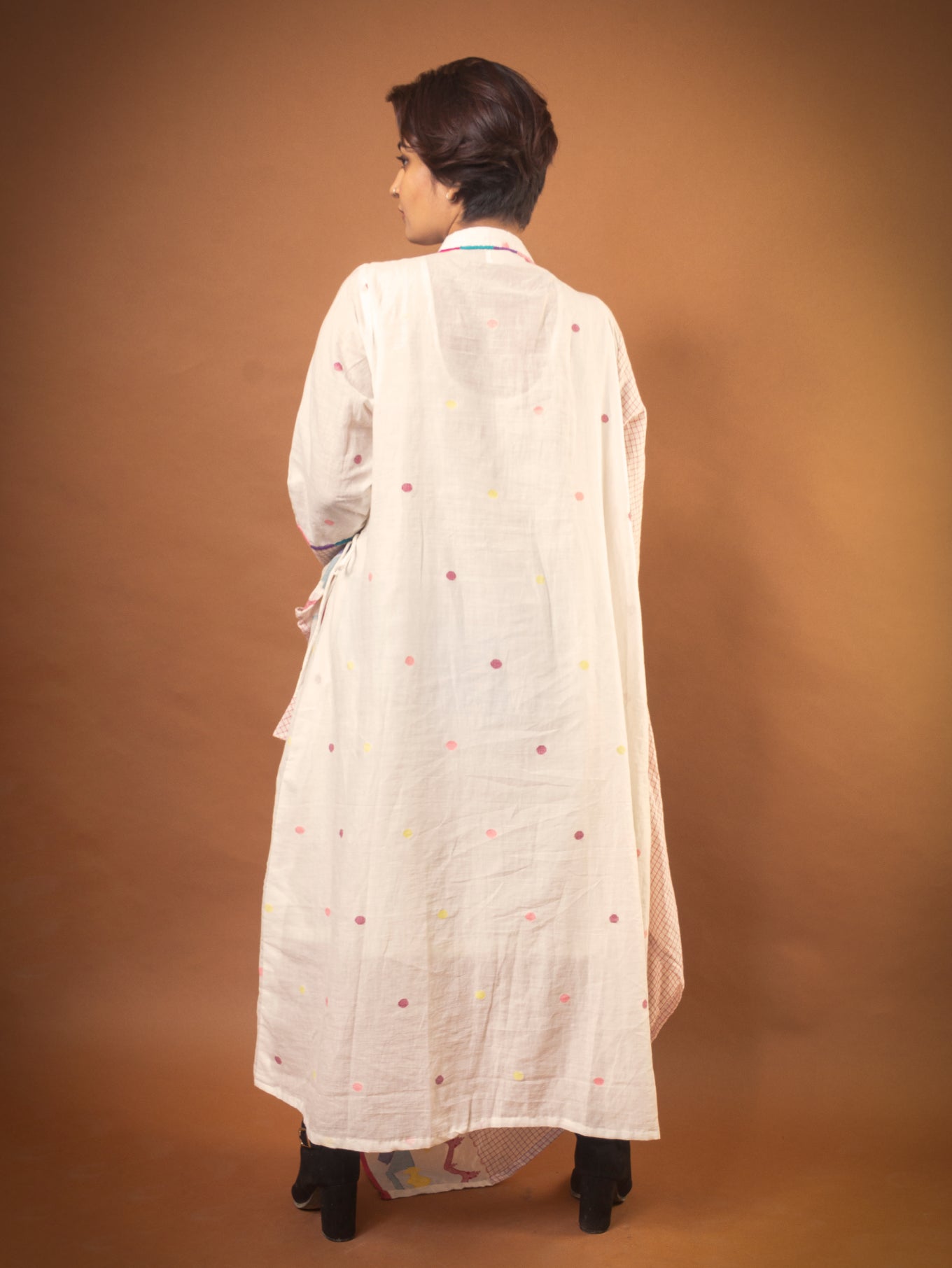 The Jamdani Overlap Dress combines traditional craftsmanship with modern style. Featuring intricate handwoven patterns and a unique overlap design, this dress offers both elegance and comfort, perfect for any occasion.