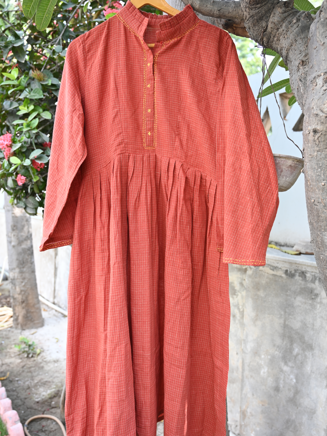 A captivating blend of comfort and sophistication. This dress is adorned with delicate handwork details around the neckline, adding a touch of elegance to its timeless chex pattern.