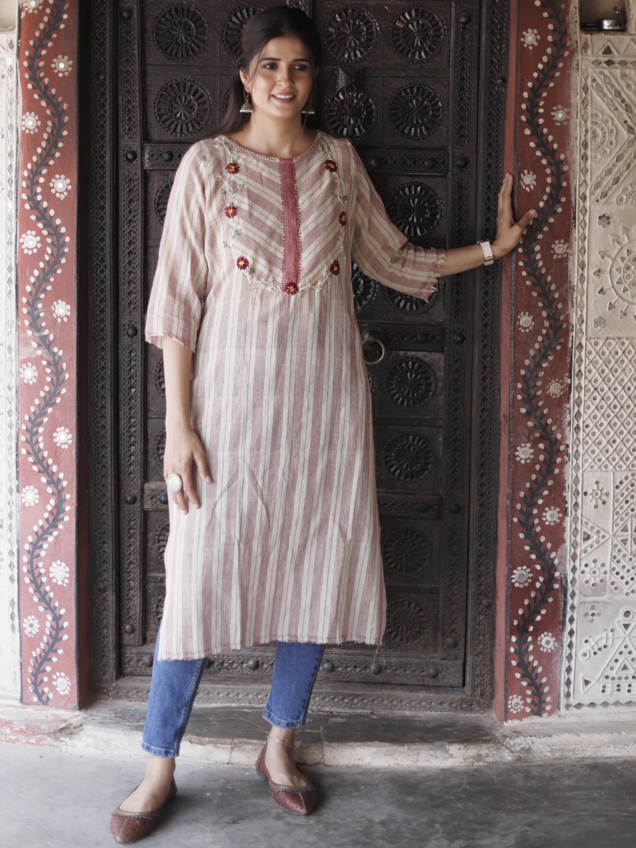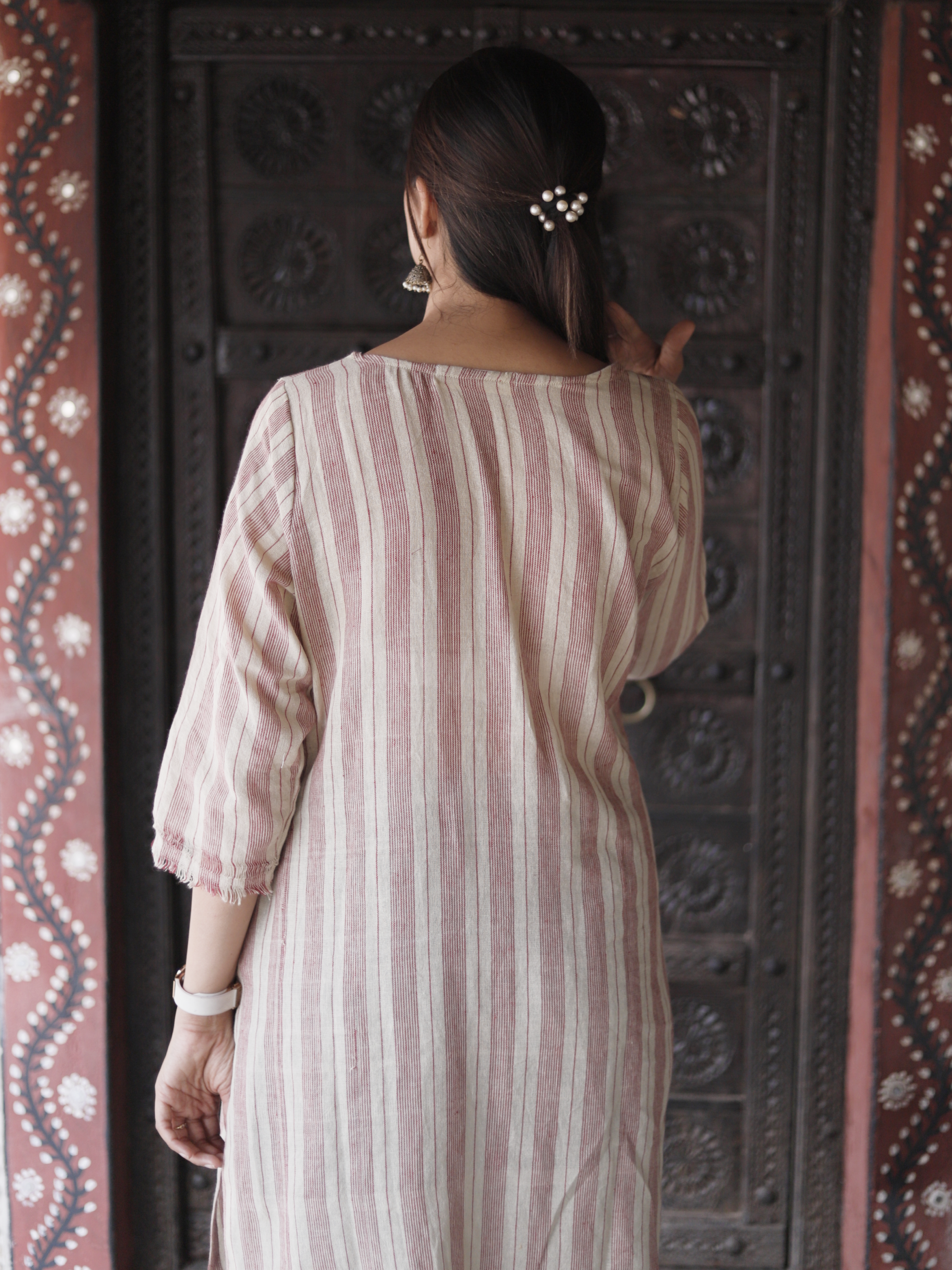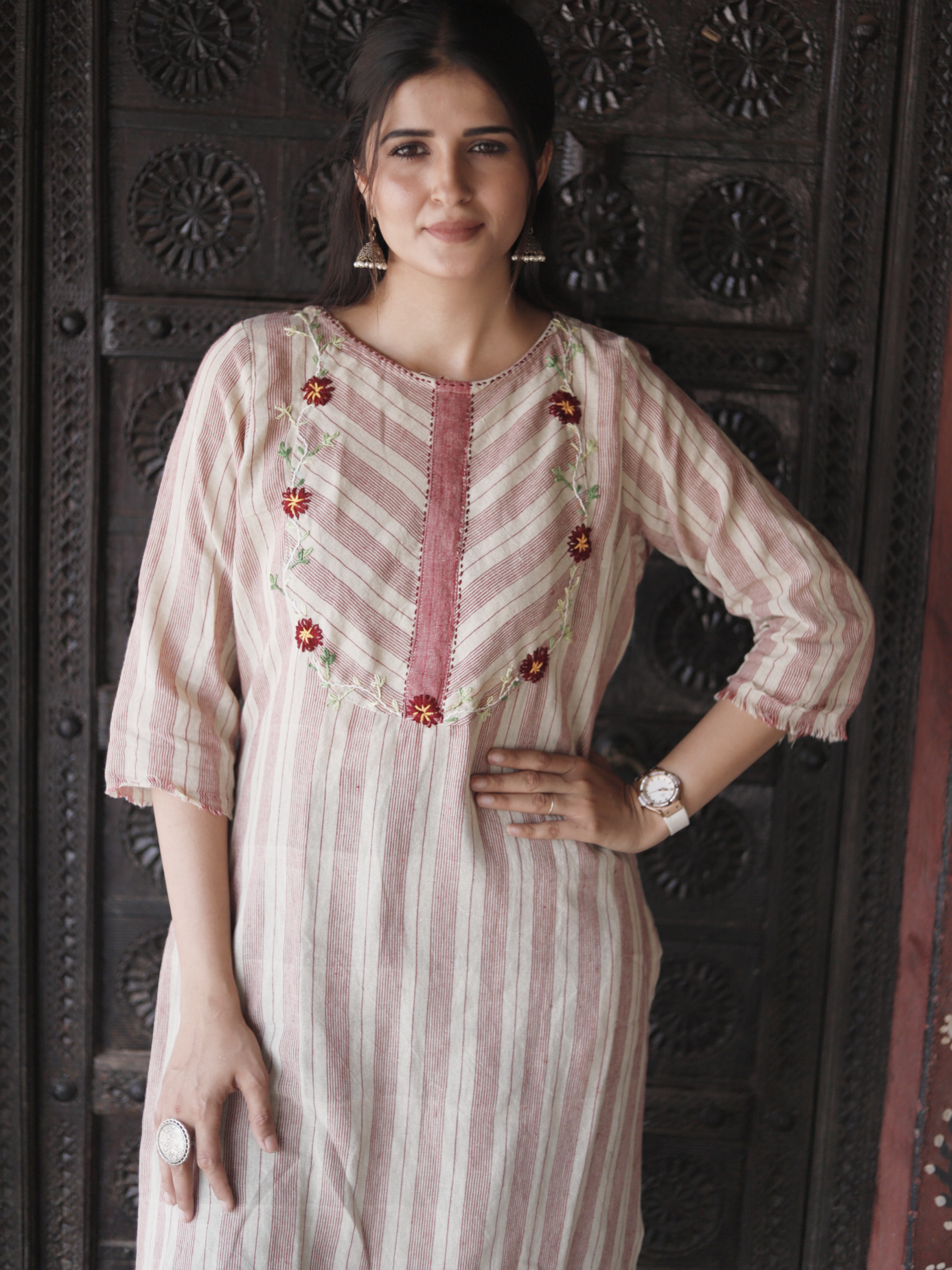 Kurti adorned with intricate handwork detailing on the neckline – a true masterpiece that embodies elegance and craftsmanship.