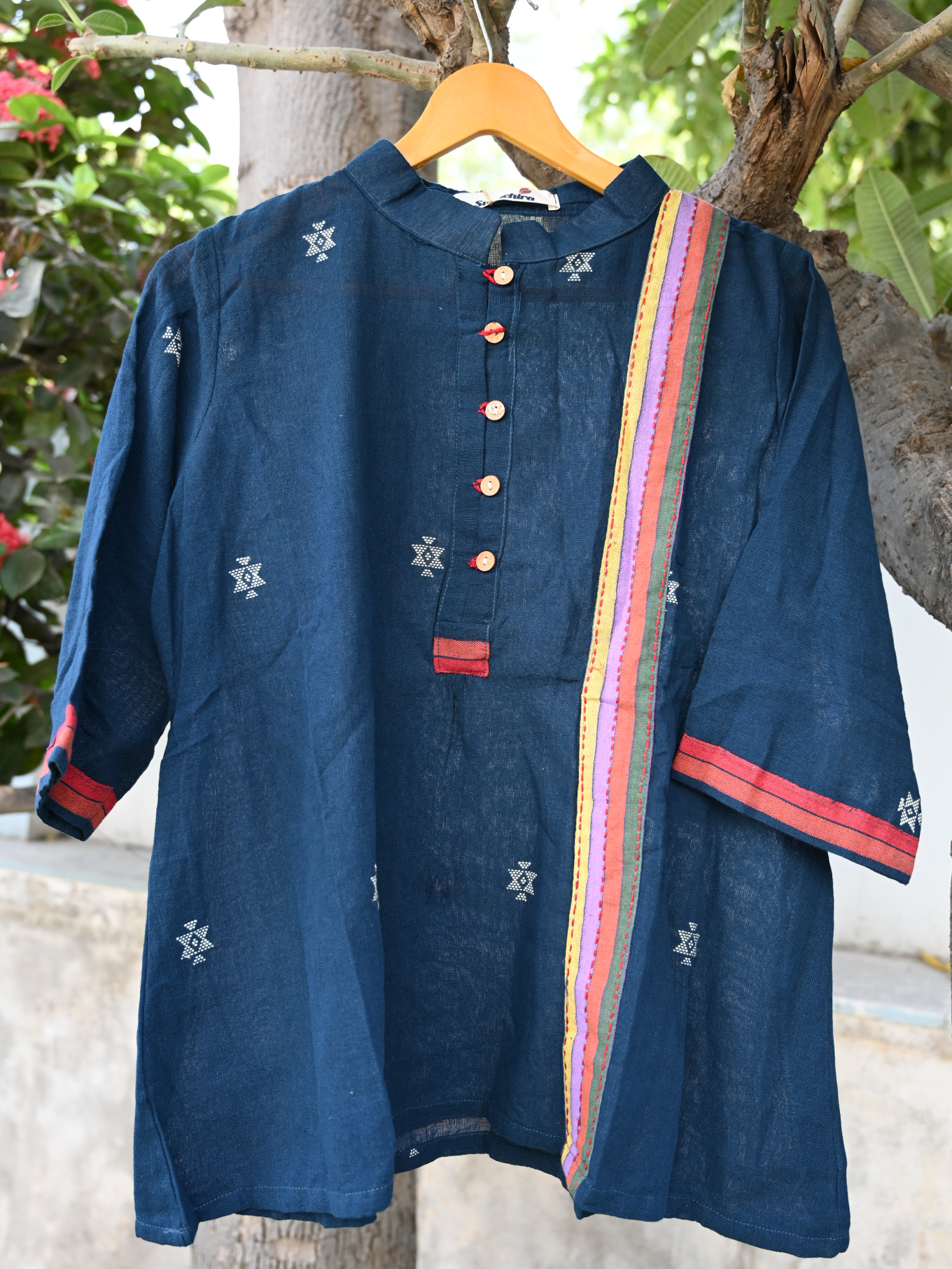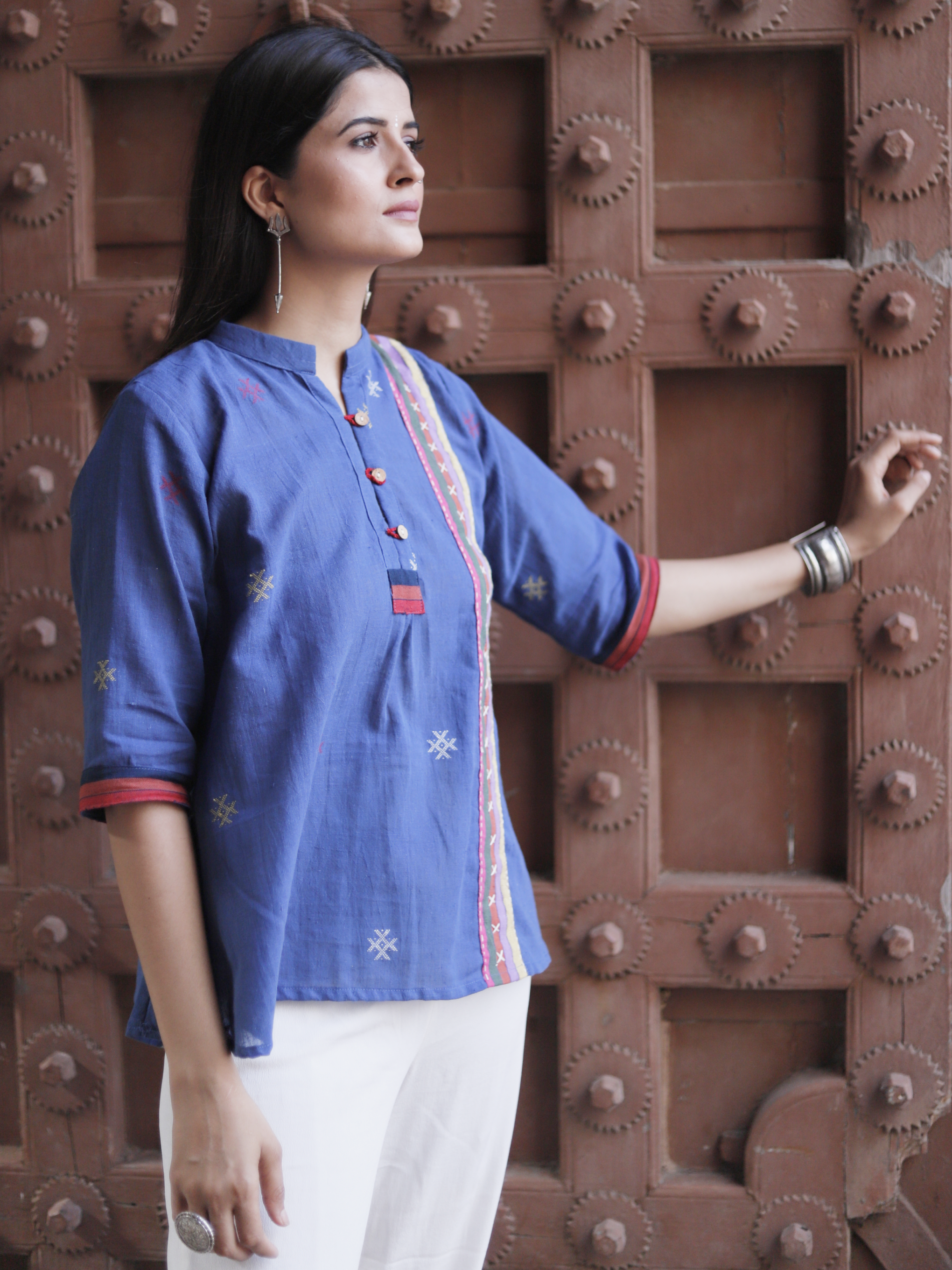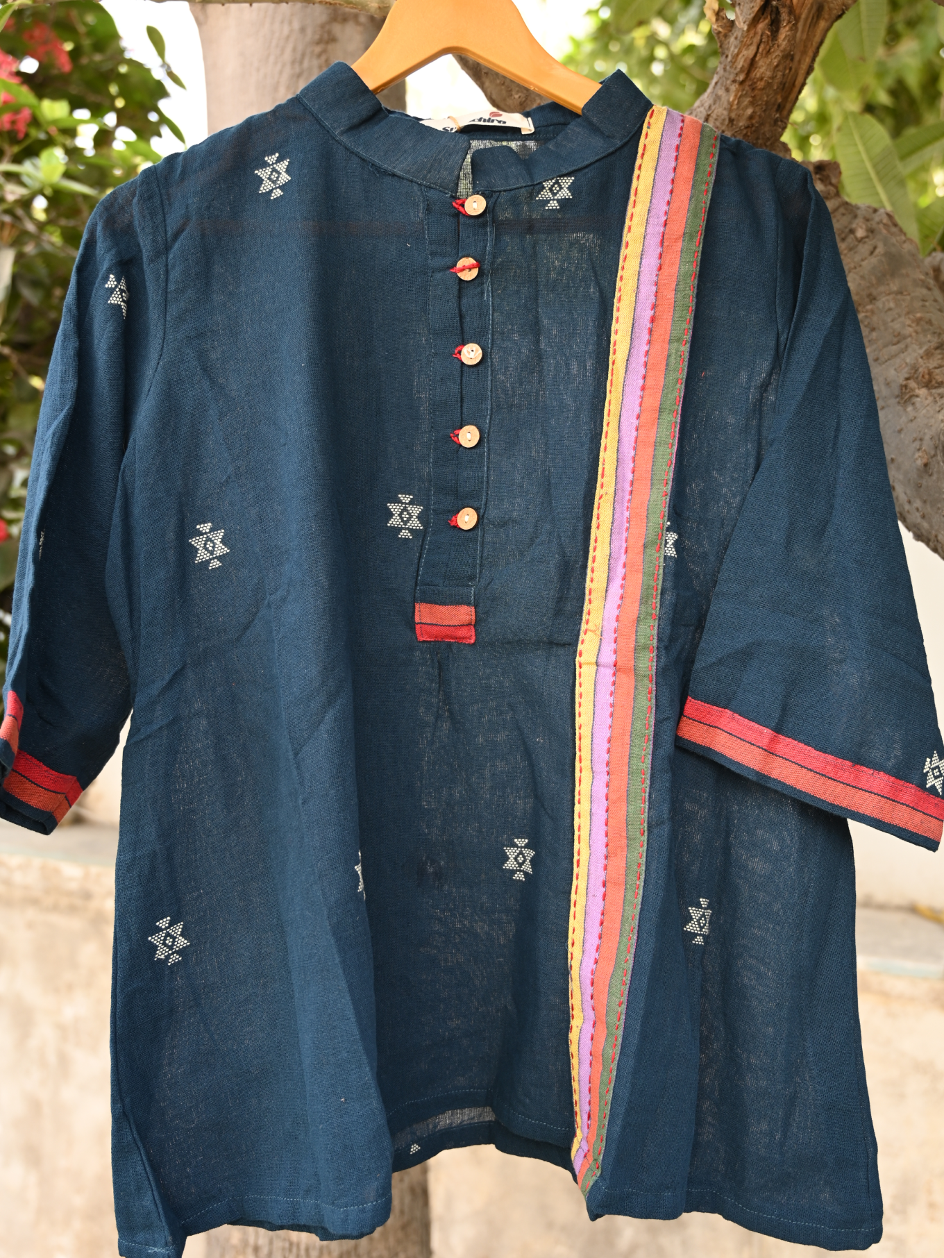 Adorned with exquisite chomukh motifs – a celebration of craftsmanship and culture. This top brings together the timeless elegance of Kala Cotton with the intricate beauty of chomukh motifs, creating a unique fusion that pays homage to traditional artistry.