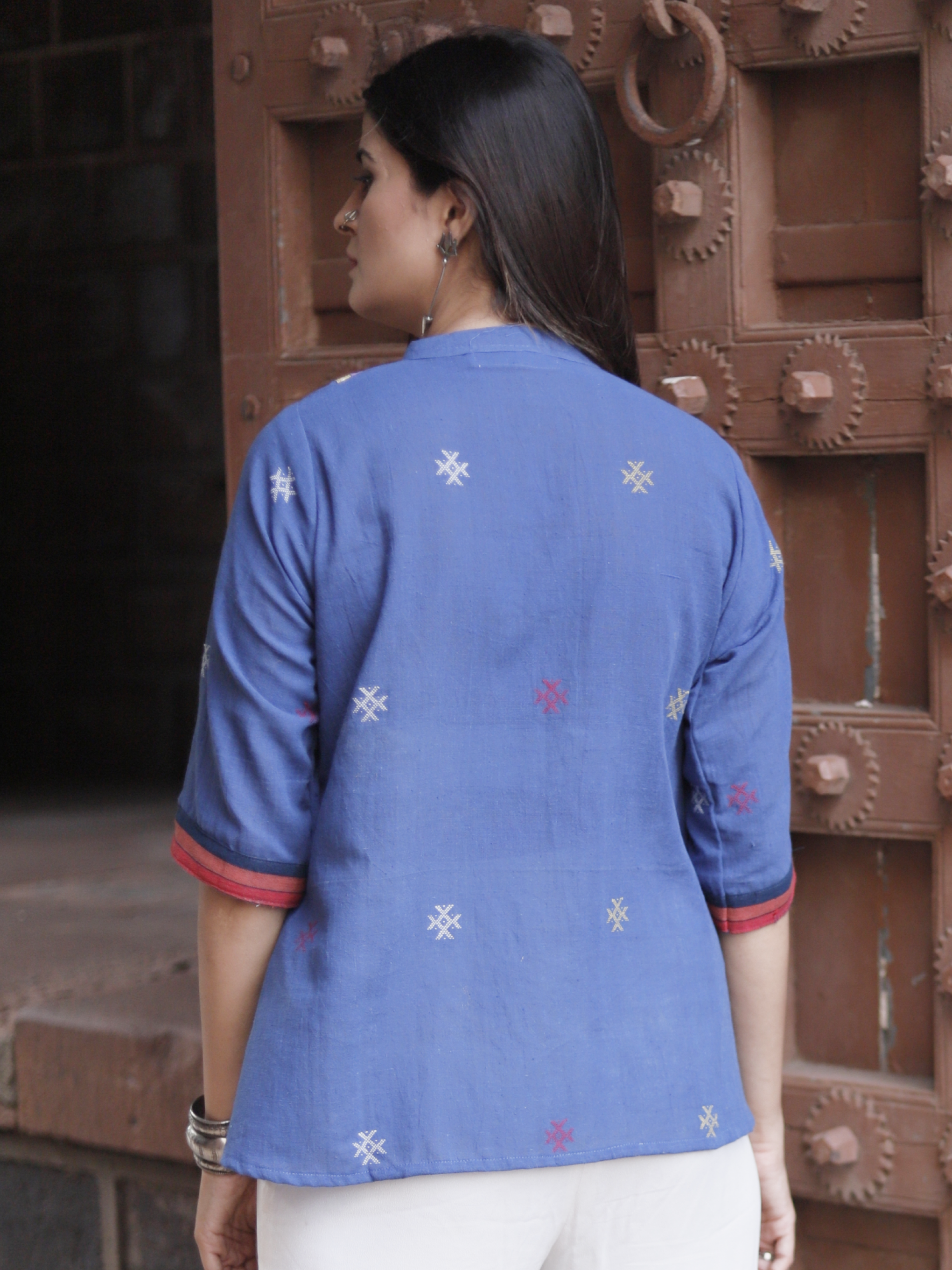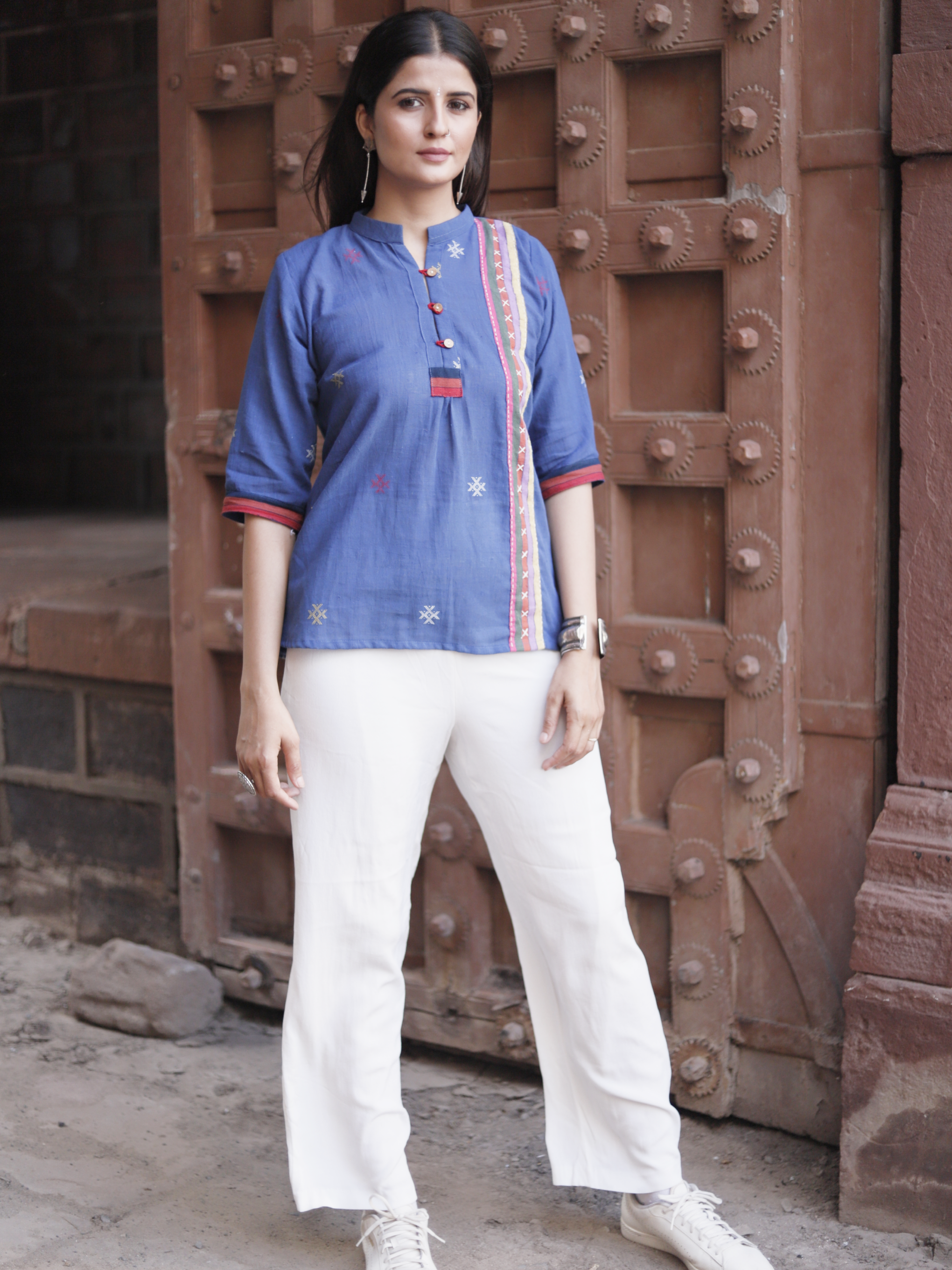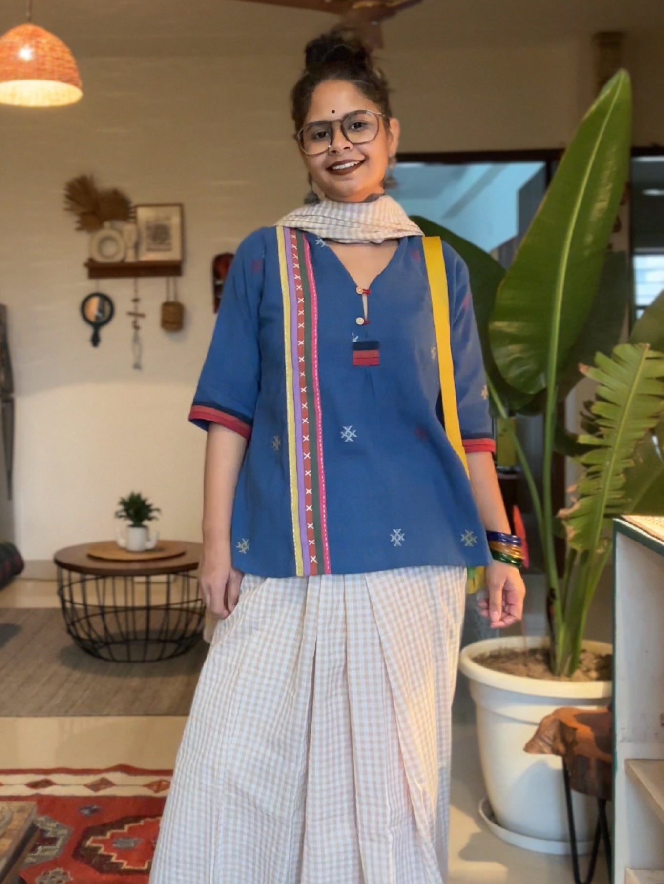 Adorned with exquisite chomukh motifs – a celebration of craftsmanship and culture. This top brings together the timeless elegance of Kala Cotton with the intricate beauty of chomukh motifs, creating a unique fusion that pays homage to traditional artistry.