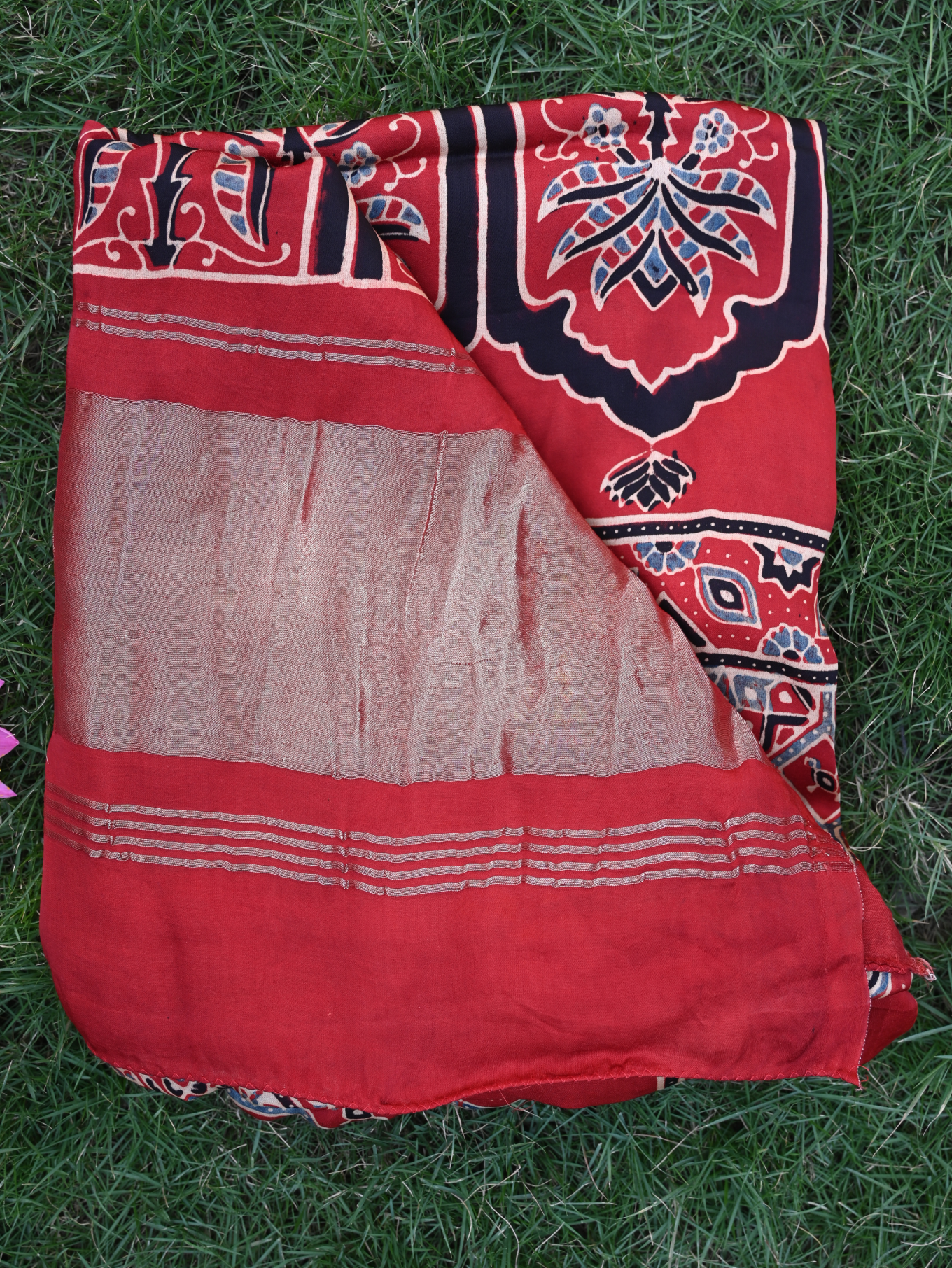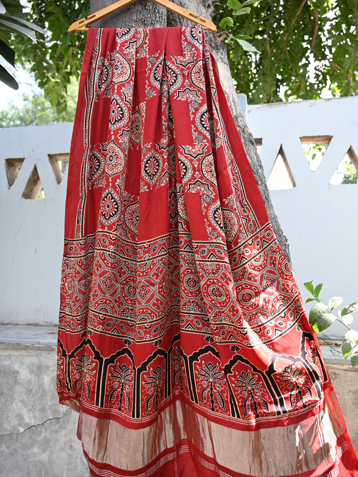 Add a touch of sophistication with our Ajrakh Modal Silk Dupatta in a bold red hue, featuring a delicate zari pallu. The rich Ajrakh print combined with the shimmering zari creates a perfect blend of traditional charm and modern elegance, ideal for festive occasions.