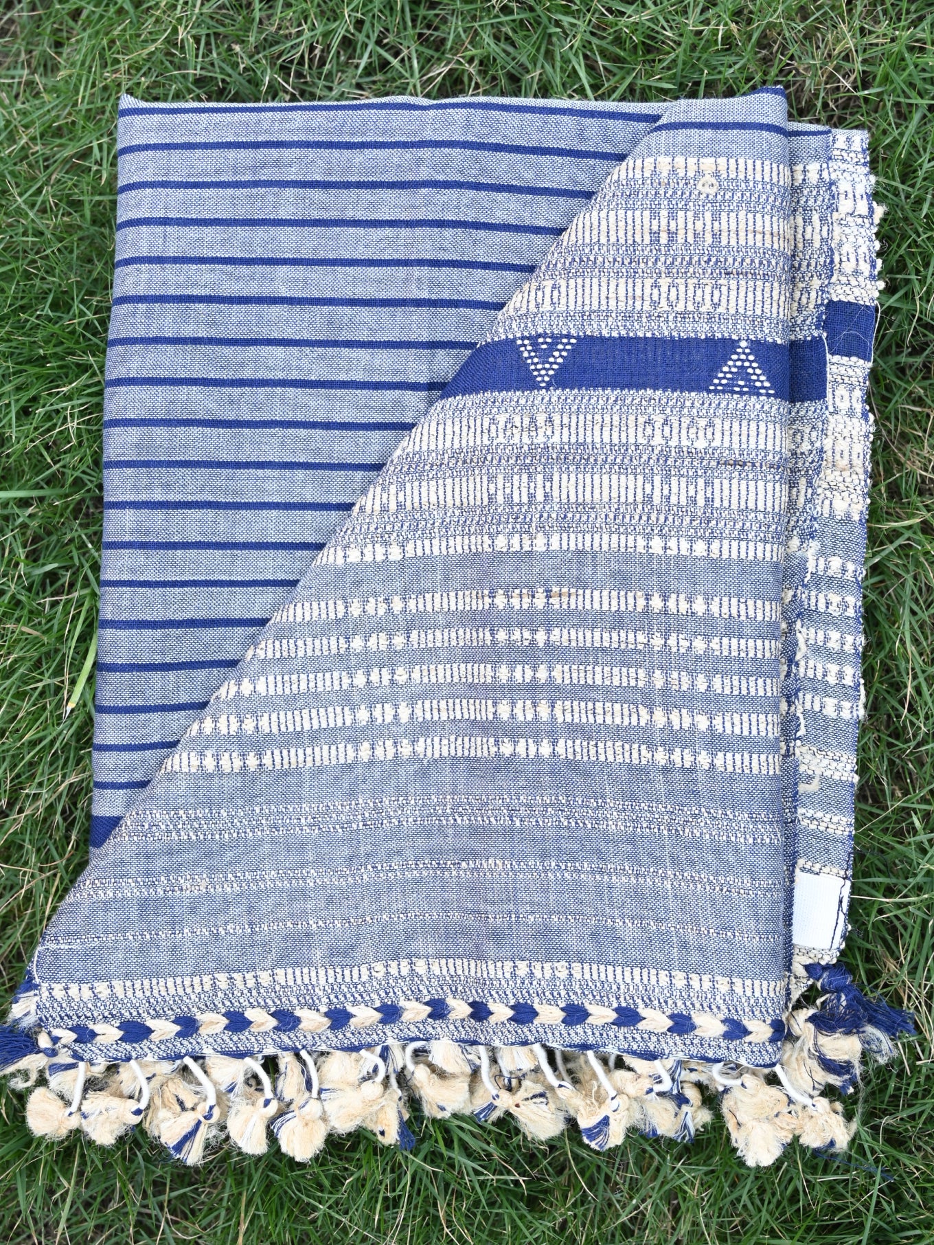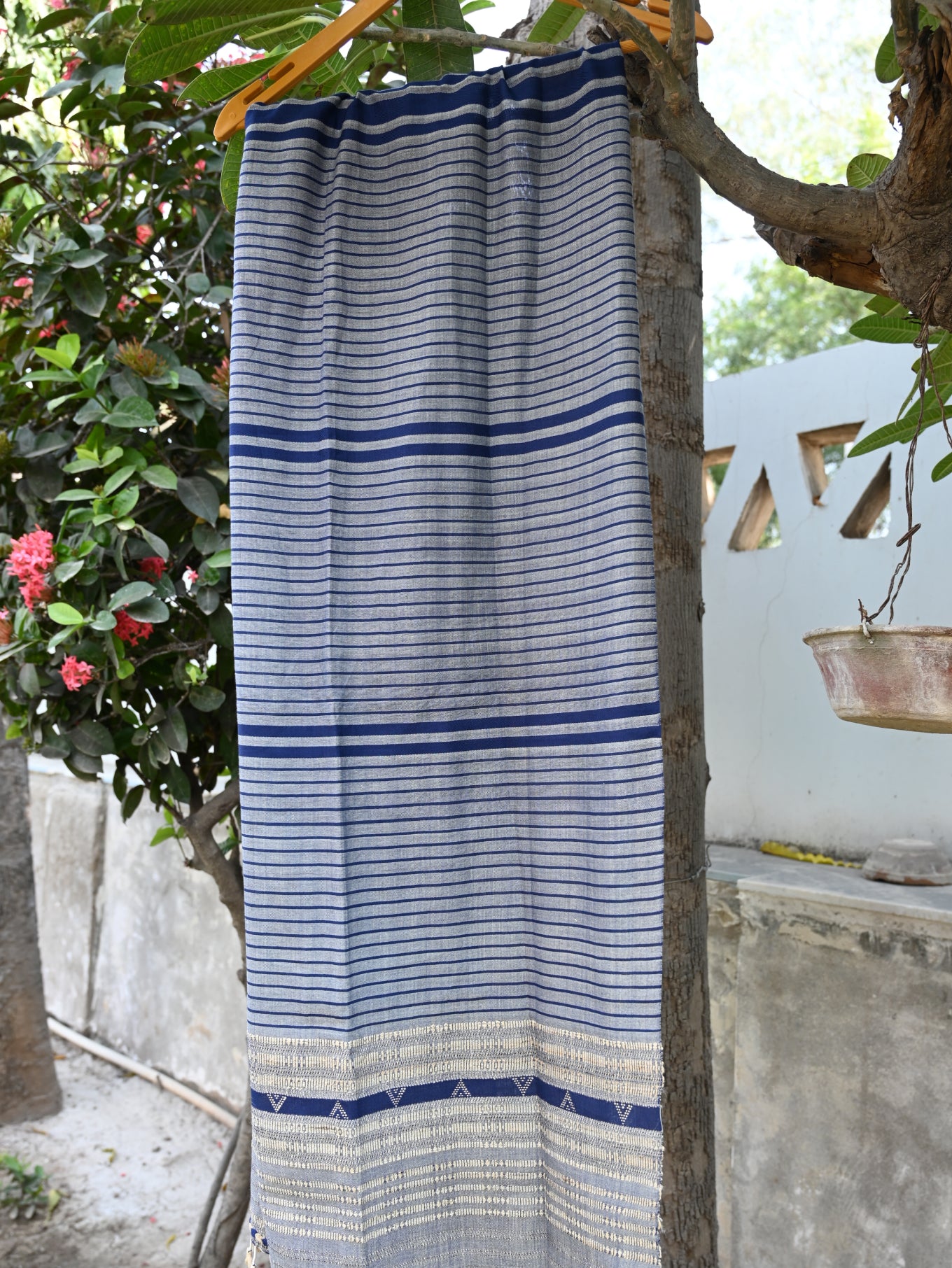 Stylish blue and grey striped woven stole made from a blend of Kala cotton and Tussar silk, combining durability with a modern, artistic design.