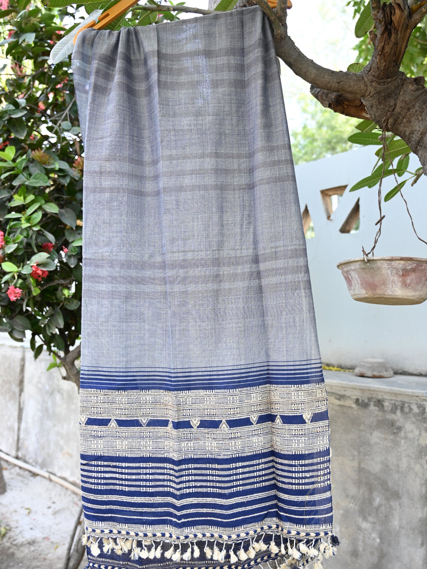 Light grey and blue woven stole crafted from a blend of Kala cotton and Tussar silk, showcasing a harmonious mix of natural elegance and handcrafted sophistication.