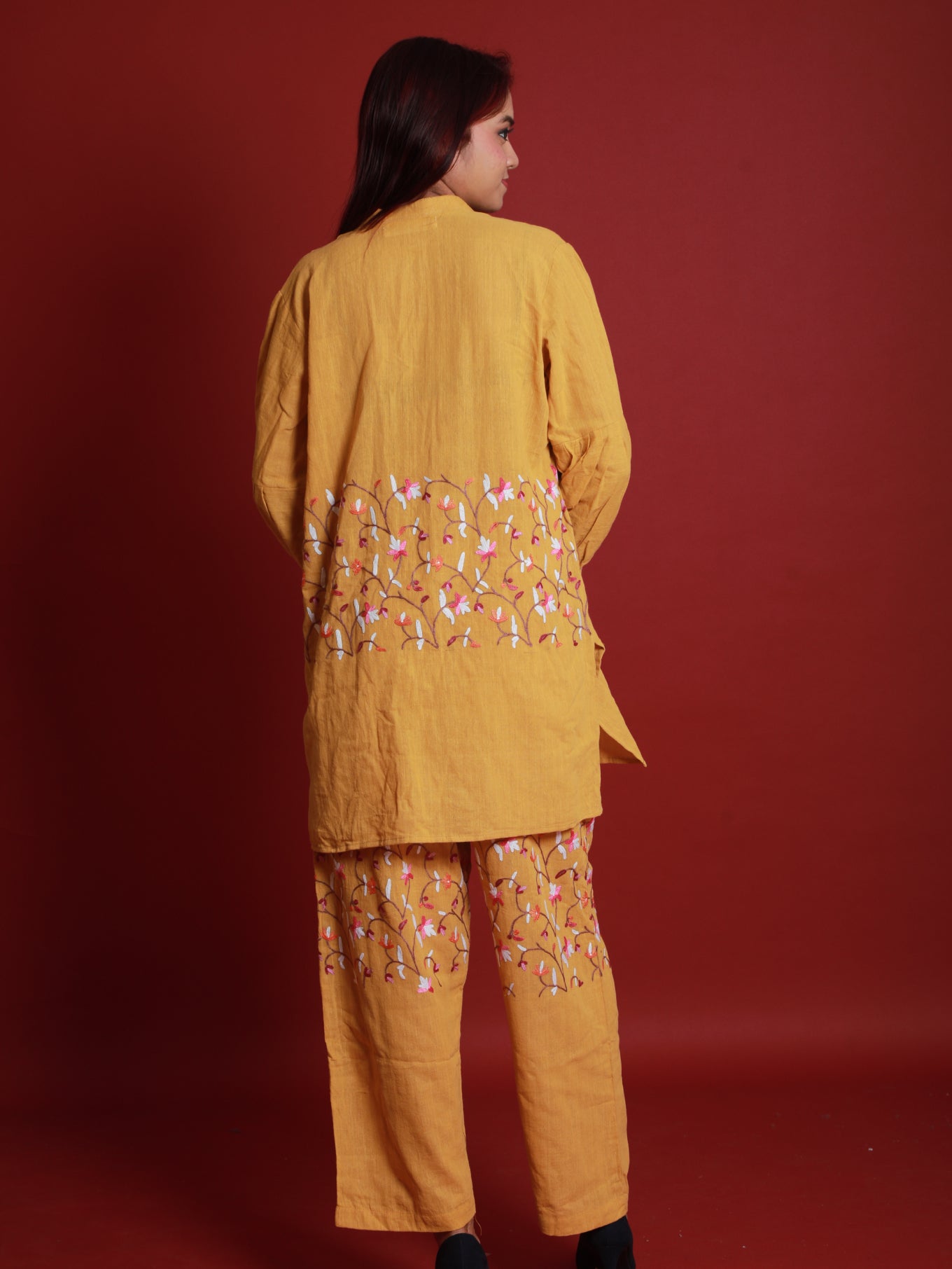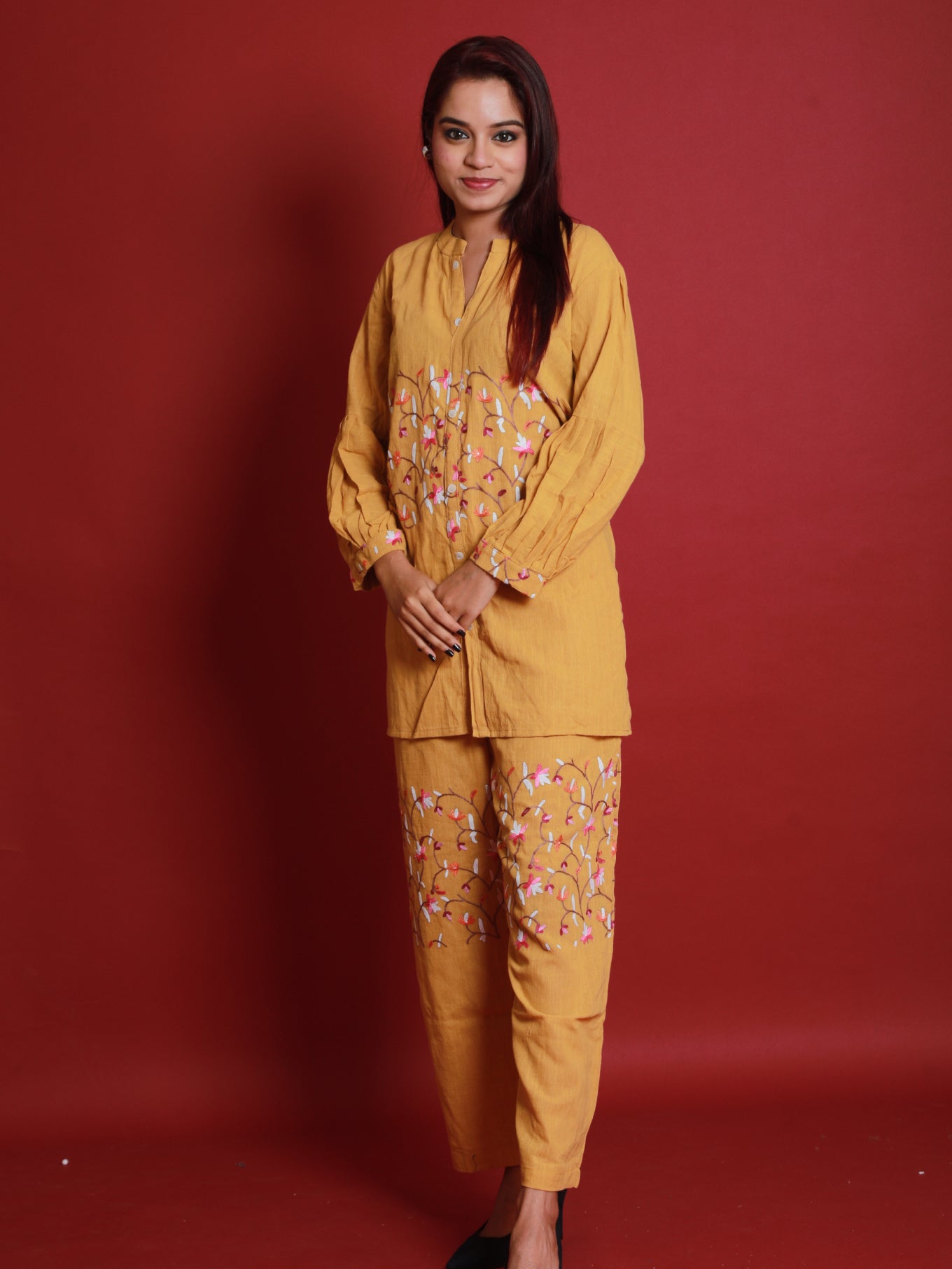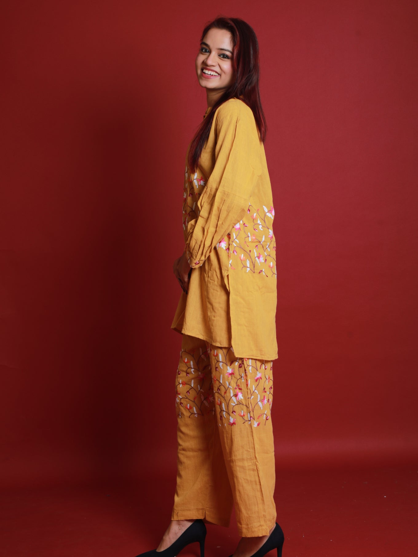 This 2-piece set made from Kala cotton features exquisite Kashmiri embroidery. Its soft, eco-friendly fabric and intricate detailing make it an ideal choice for stylish, sustainable fashion.