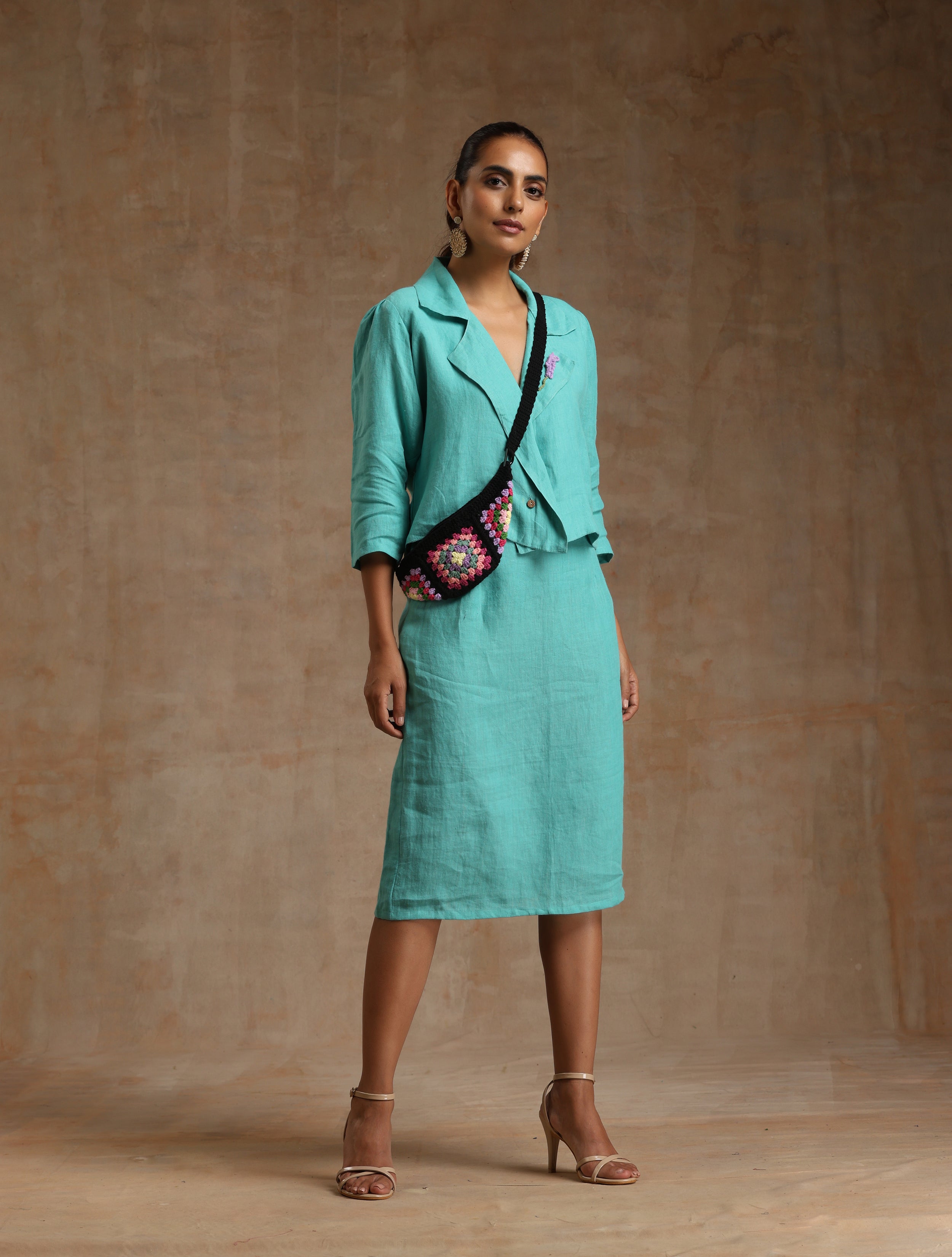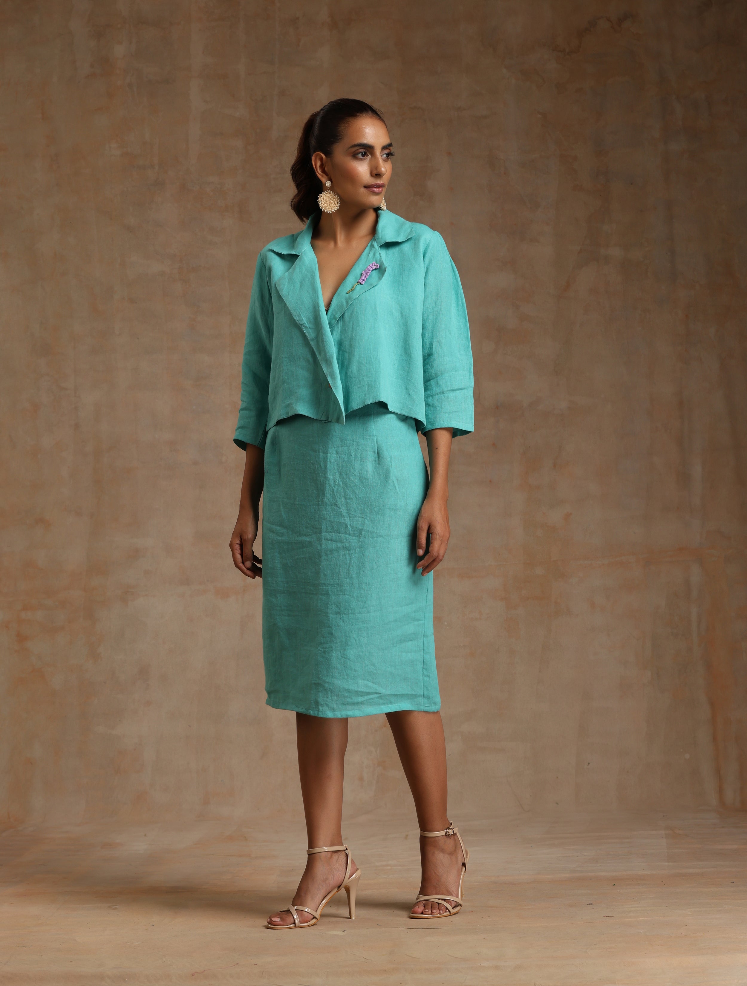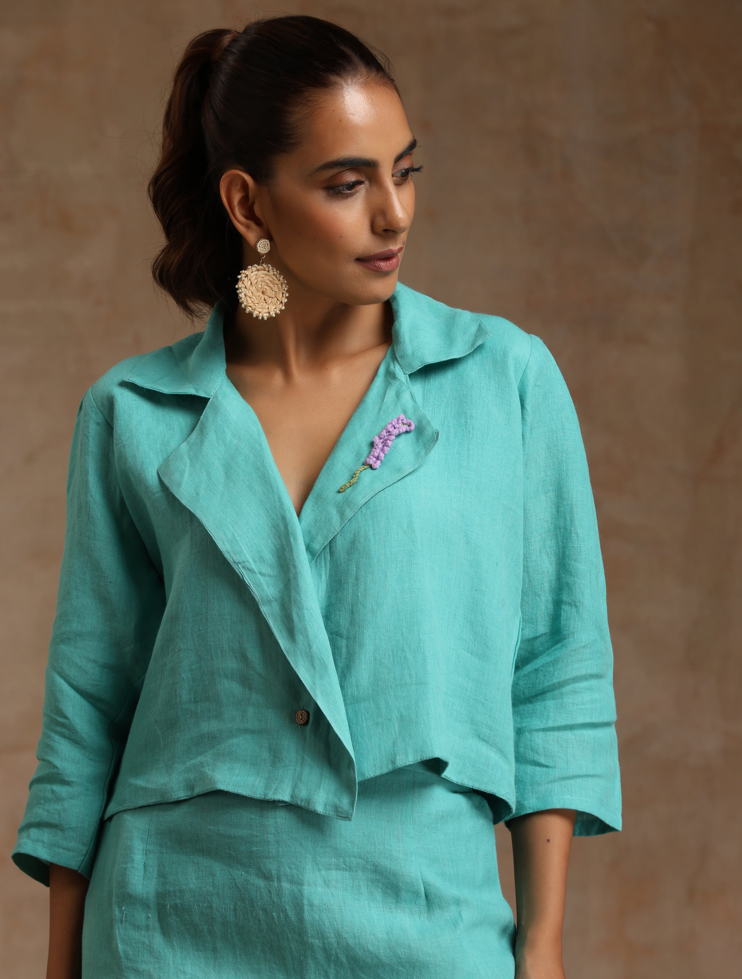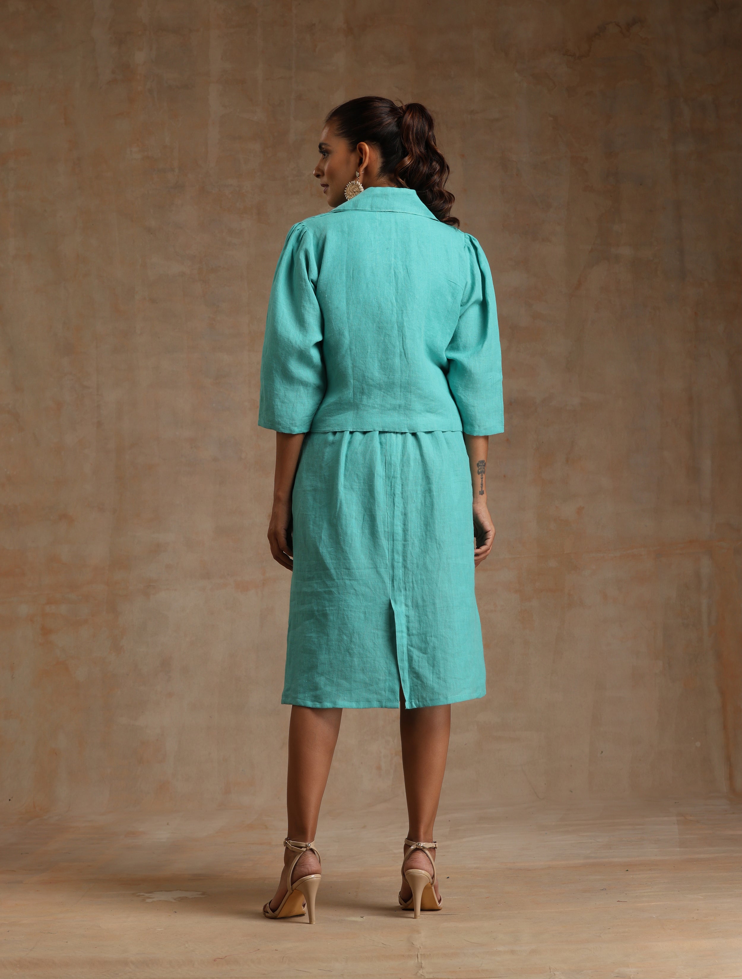 Set epitomized sophistication, a sartorial symphony of power and style. Each piece, like a stroke of azure brilliance, wove a narrative of confidence and poised allure, a modern ode to timeless elegance. 70 Lea Pure Linen