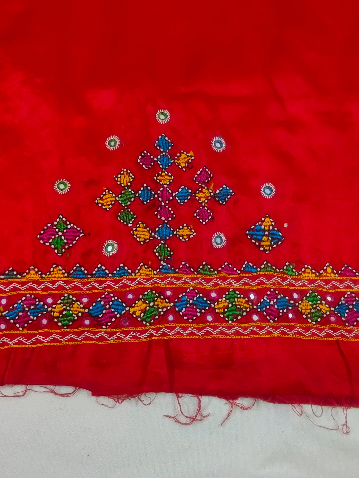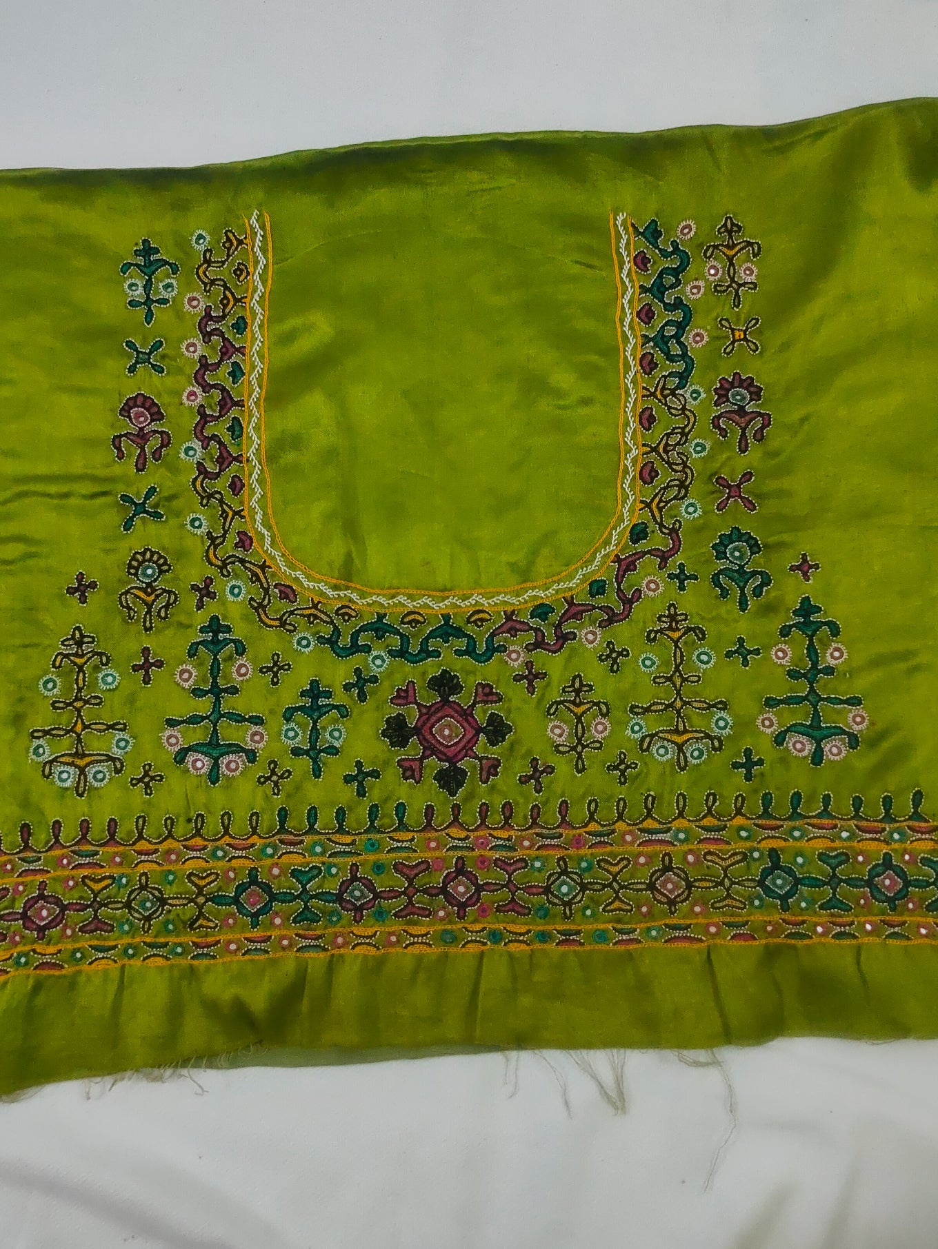 Discover the elegance of traditional Mutva work with our unstitched blouse piece. Featuring meticulously crafted, repetitive motifs inspired by Gujarat's rich embroidery heritage, this fabric adds a touch of timeless artistry to your wardrobe. Perfect for pairing with sarees or lehengas, it offers versatility and sophistication, ready to be tailored to your style.