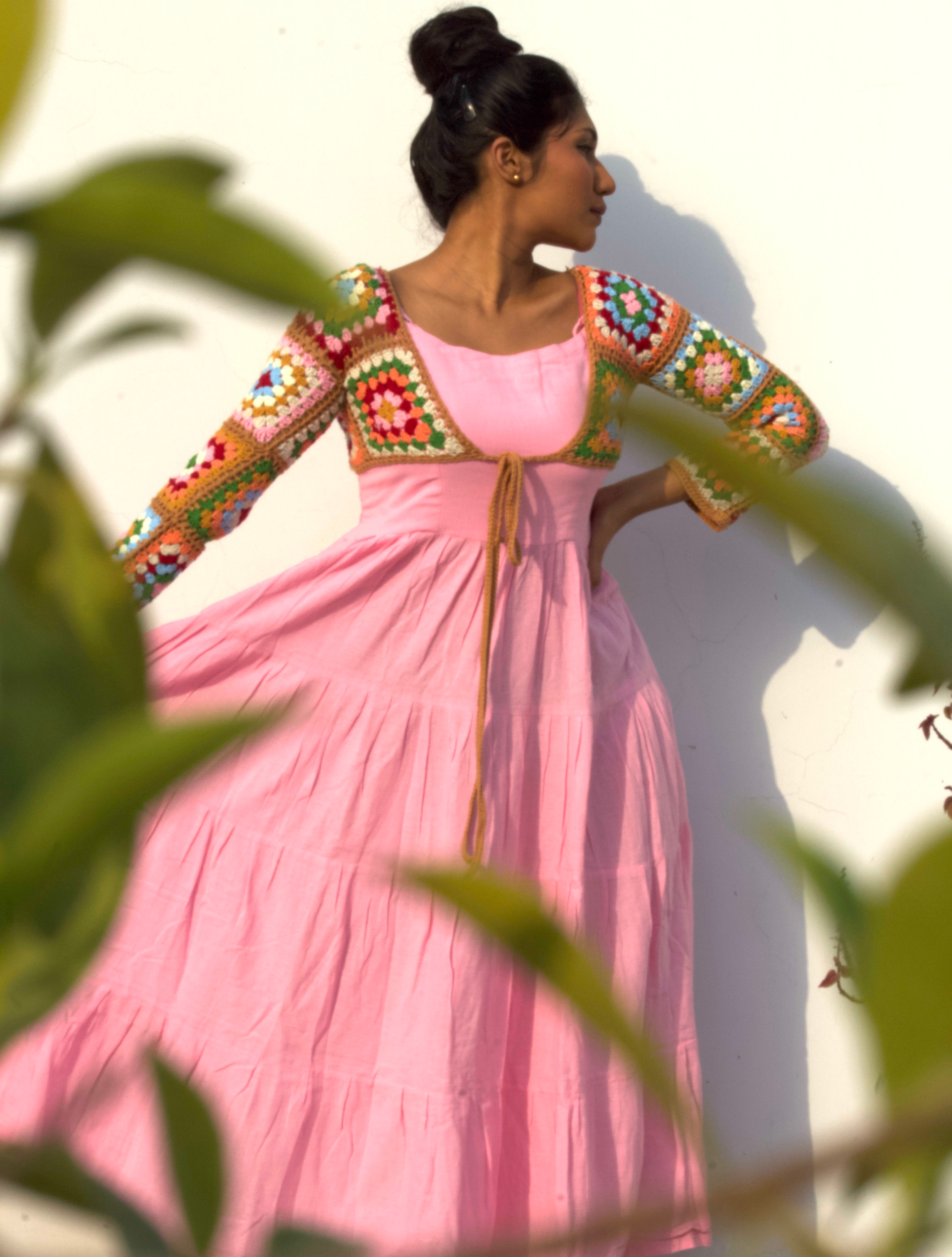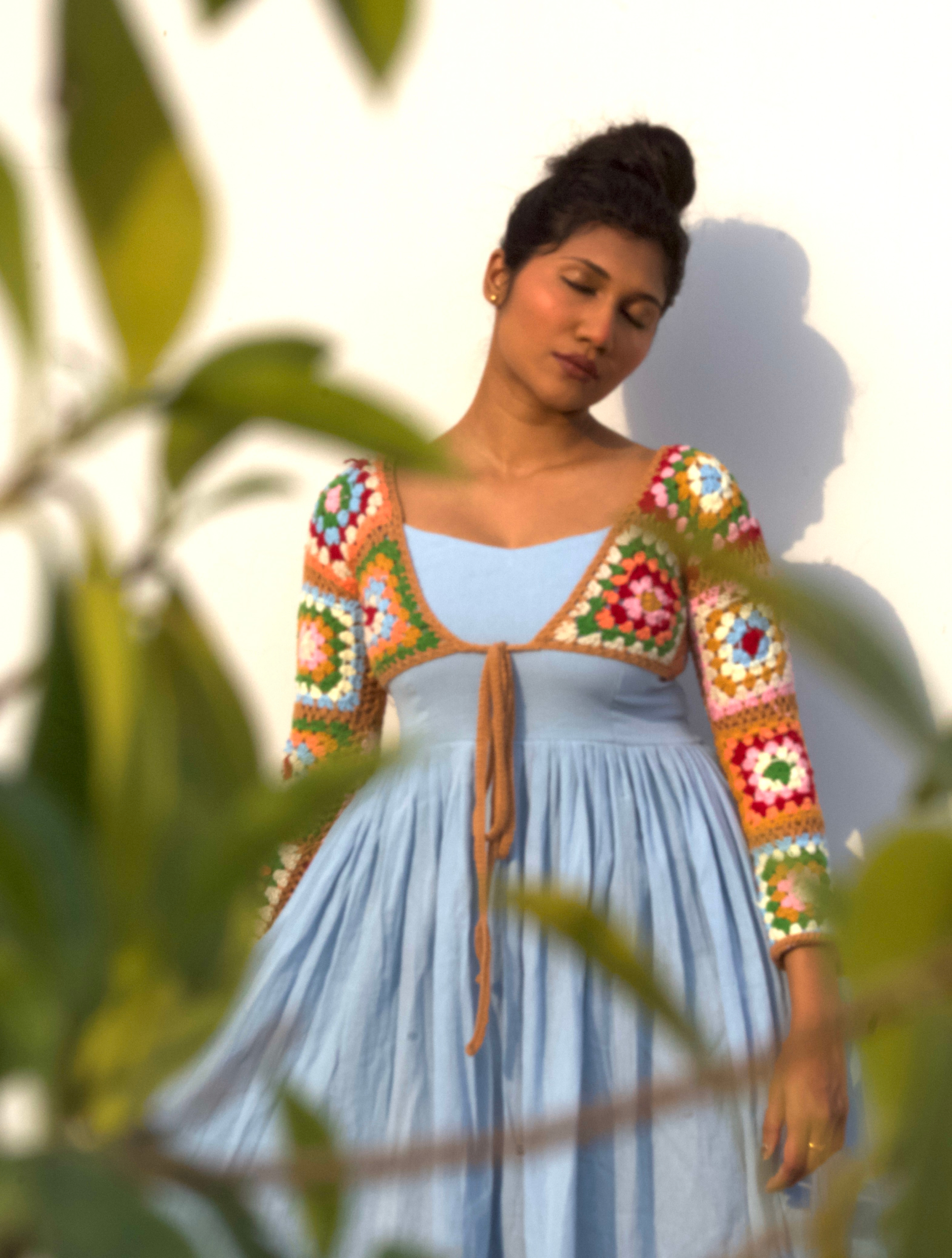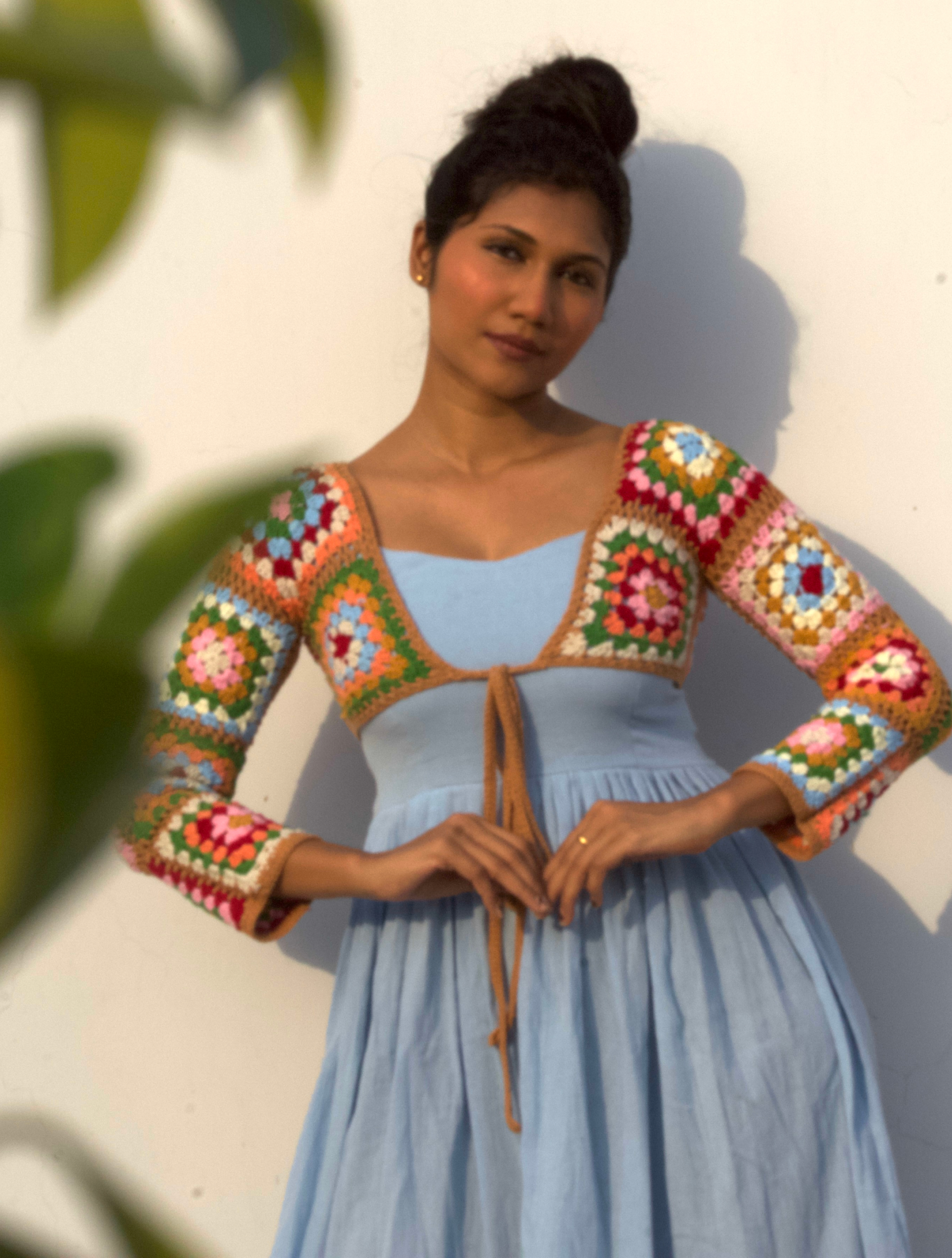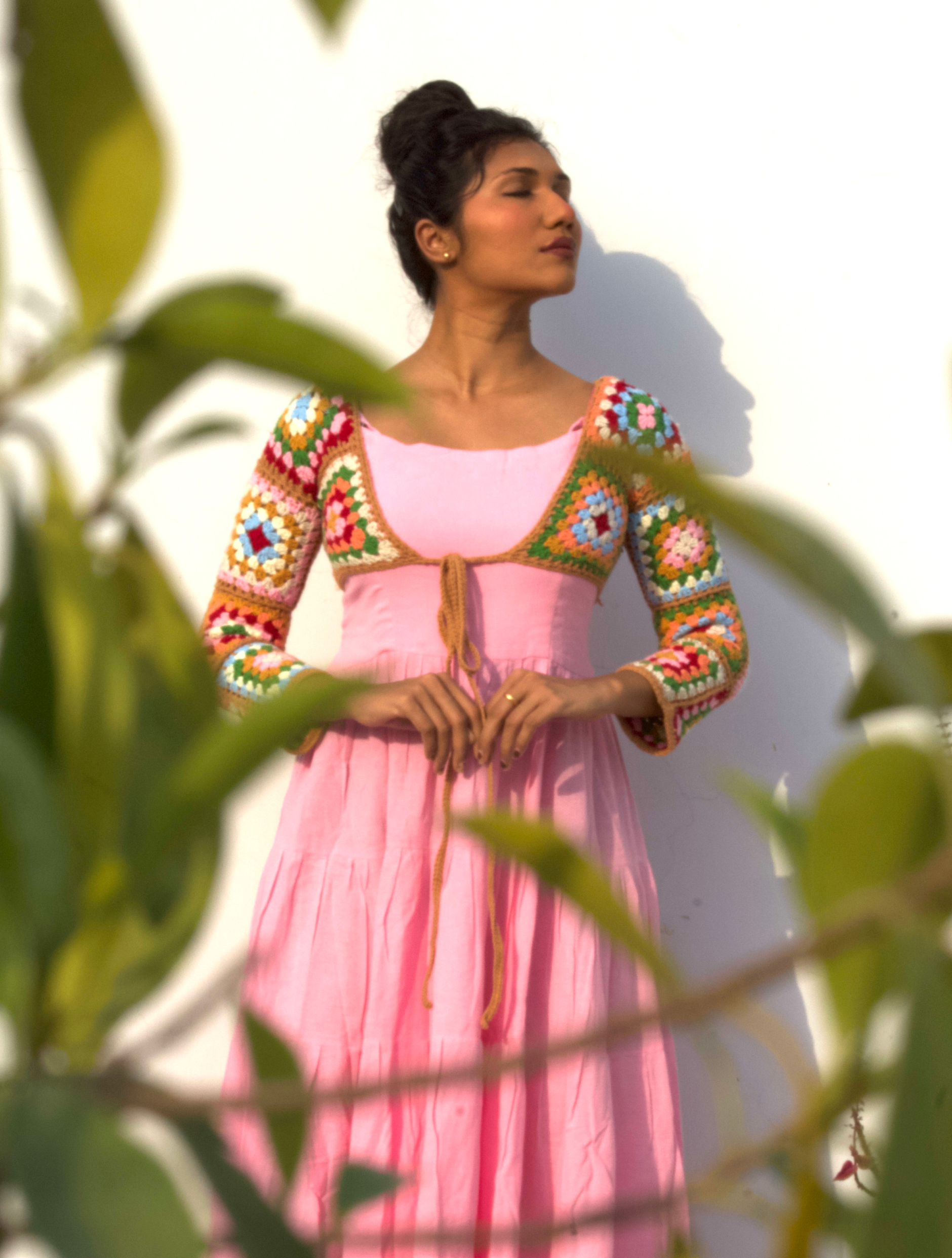 A delightful fusion of soft elegance and vibrant charm, this dress features a handcrafted crochet shrug.