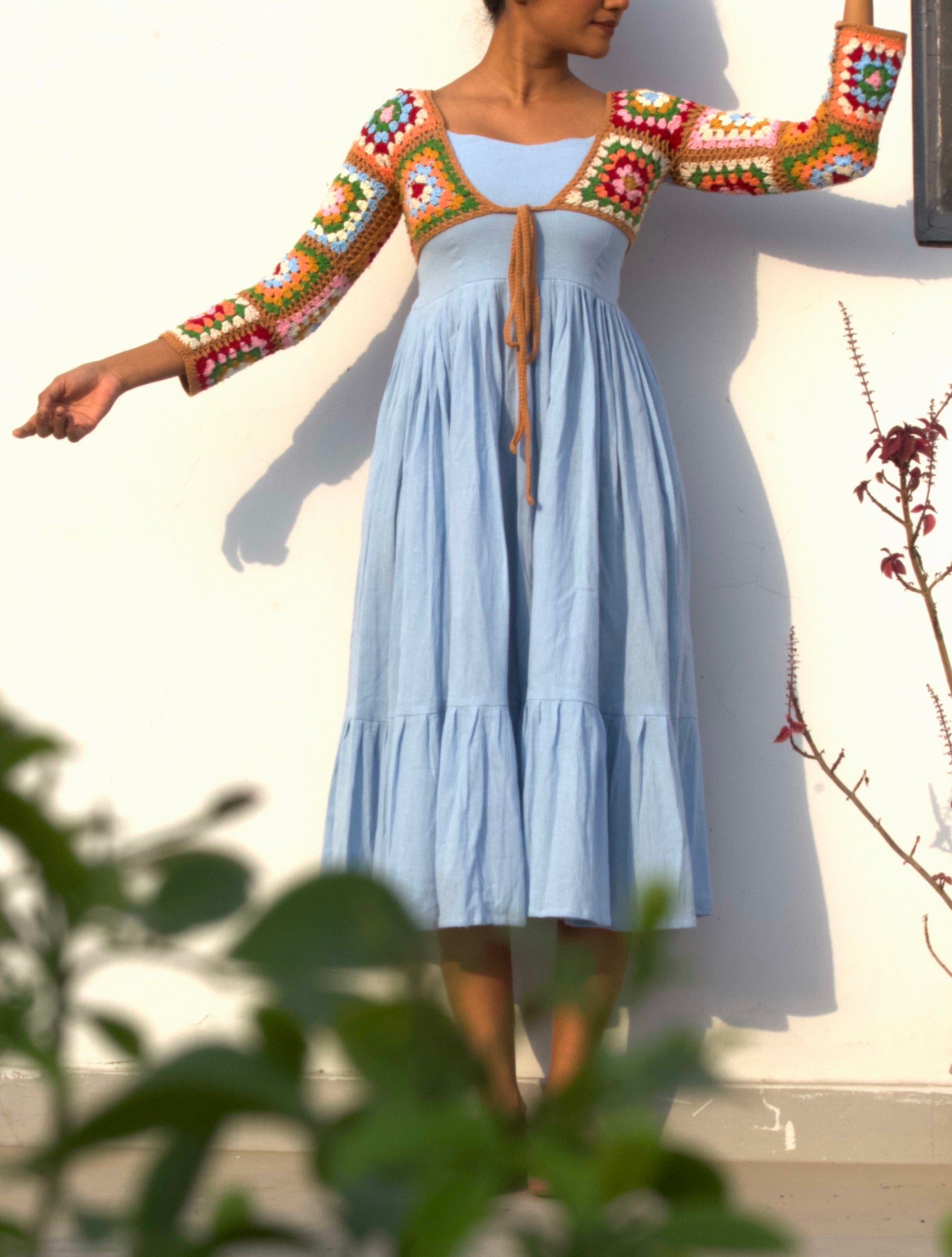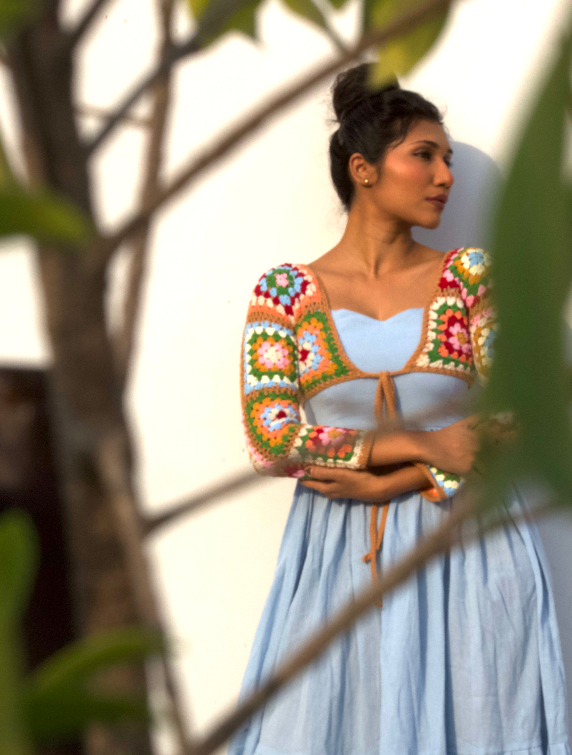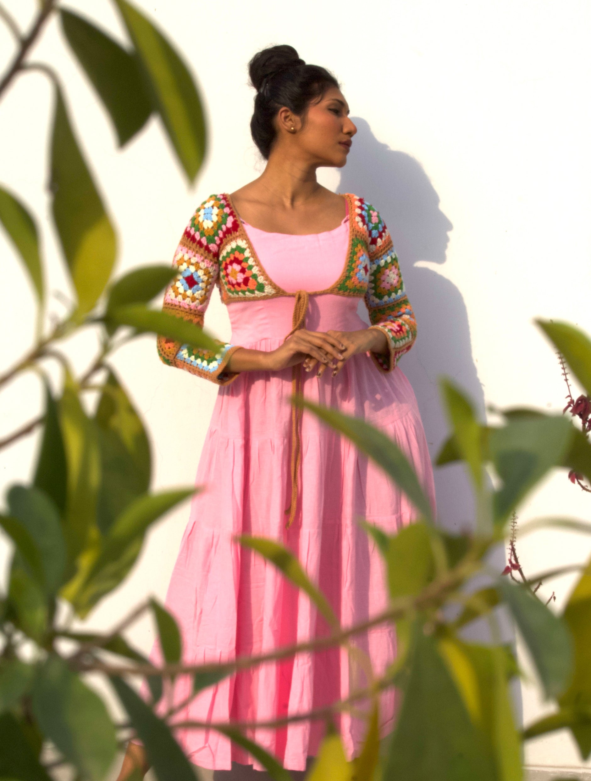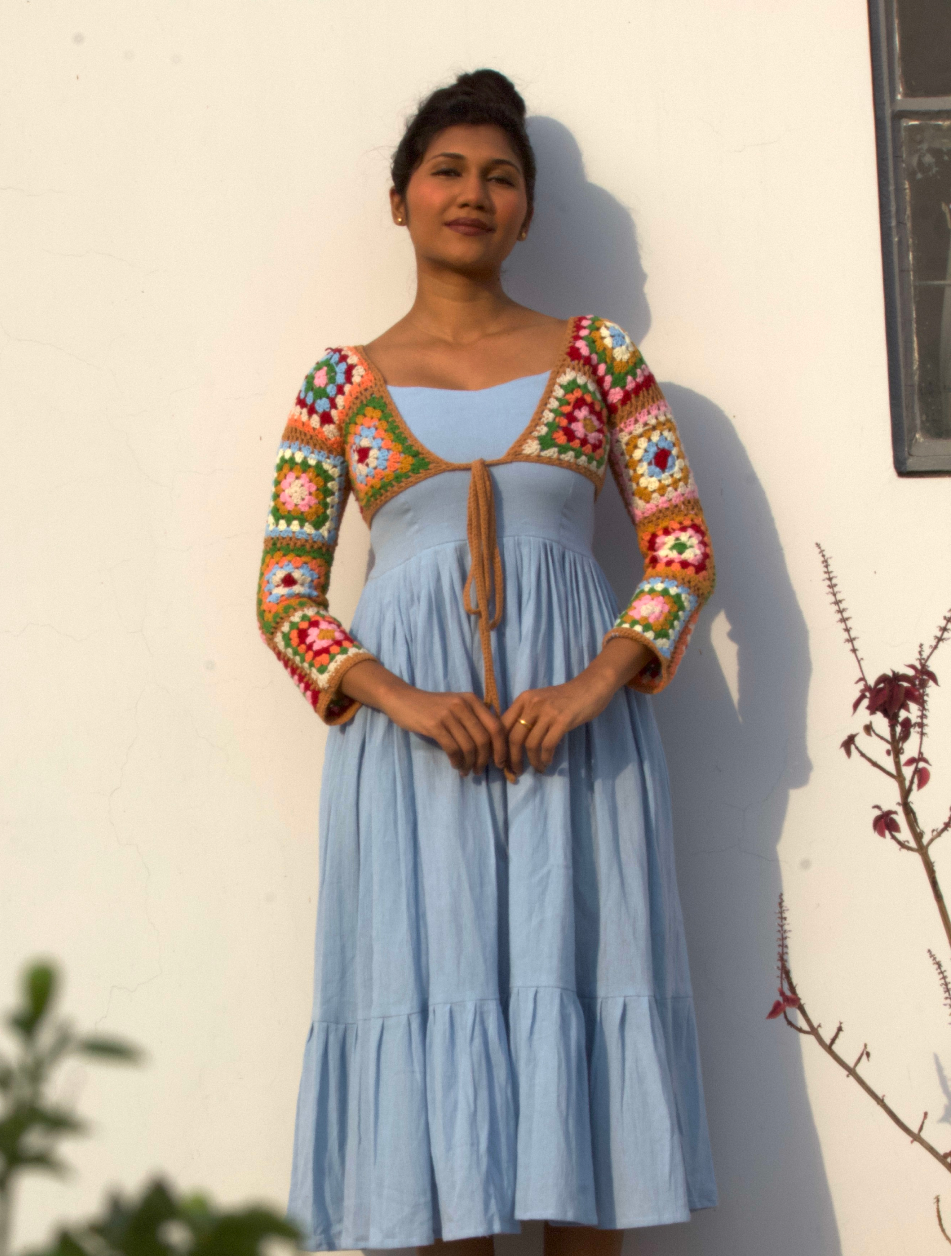 A delightful fusion of soft elegance and vibrant charm, this dress features a handcrafted crochet shrug.